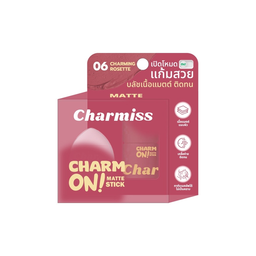 ชาร์มิส ชาร์ม ออน แมตต์สติ๊ก 06 ชาร์มมิ่ง โรเซ็ตต์ บลัชเนื้อแมตต์เนียนนุ่ม ขนาดพกพา เกลี่ยง่าย ให้สีชัดแต่บางเบา ไม่เป็นคราบ ไม่ตกร่อง สีสวยสดใส พร้อมสารบำรุงผิวในหนึ่งเดียว มอบประกายละมุนแบบซอฟต์โฟกัส มี น้ำมันเมล็ดทานตะวัน และน้ำมันเมล็ดองุ่น ช่วยปลอบประโลมและเติมความชุ่มชื้น วิตามินอี และอนุพันธ์วิตามินซี เสริมการบำรุงผิวด้วยพลังแอนตี้ออกซิแดนท์ น้ำมันซีบัคธอร์น เพื่อผิวดูเปล่งปลั่งมีชีวิตชีวา มาในแท่งขนาดกะทัดรัด พกพาสะดวก เติมสีสันได้ทุกที่ทุกเวลา เติมความสดใสให้ผิวในพริบตาเนื้อบาล์มบางเบา ที่มอบสีระเรื่อเป็นธรรมชาติ พร้อมประกายเงาใสแบบกลาสซี่ ฟินิชดูผิวฉ่ำน้ำ สุขภาพดี