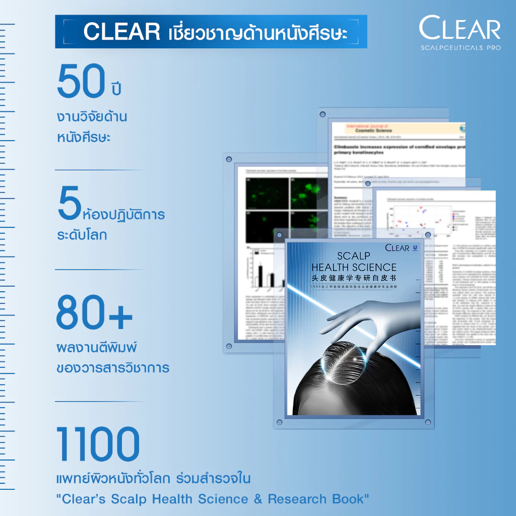 เคลียร์ สกาล์ปซูติคอลส์ โปร สกาล์ป เดอร์มา เซรั่ม แดนดรัฟ ดีเฟนซ์ ผลิตภัณฑ์บำรุงหนังศีรษะและเส้นผมแบบไม่ต้องล้างออกเหมาะสำหรับผู้ที่มีปัญหารังแค อาการคัน และหนังศีรษะอ่อนแอด้วยเทคโนโลยี Barrier Repair ช่วยฟื้นบำรุงเกราะป้องกันของหนังศีรษะ เสริมการปกป้องหนังศีรษะจากรังแคได้มากขึ้นถึง 4 เท่าภายใน 4 สัปดาห์ พร้อมลดการเกิดซ้ำและช่วยปรับสมดุลความชุ่นชื้นของหนังศีรษะได้อย่างมีประสิทธิภาพ Piroctone Olamine (White text, black highlight) สารขจัดรังแคเพื่อหนังศีรษะที่แข็งแรง เซรั่มแบบไม่ต้องล้างออกตัวนี้สามารถช่วยปลอบประโลมหนังศีรษะได้ทันที และช่วยขจัดรังแคตั้งแต่ต้นตอ ปกป้องหนังศีรษะจากรังแค ได้ยาวนานขึ้นถึง 4 เท่าภายใน 4 สัปดาห์ 99 Purity Glycine (White text, black highlight) สูตรเฉพาะที่ช่วยเติมความชุ่มชื้นให้หนังศีรษะ และเสริมความแข็งแรงให้กับเกราะป้องกันของหนังศีรษะ พร้อมปลอบประโลมและลดอาการคัน อย่างมีประสิทธิภาพ Peptide Essence (White text, black highlight)ส่วนผสมเกรดสกินแคร์ ช่วยเติมความชุ่มชื้นและฟื้นบำรุงการทำงานของหนังศีรษะให้กลับมาสมดุลแข็งแรง รังแคที่มองเห็นได้เมื่อใช้เป็นประจำอย่างต่อเนื่อง อาการคันเนื่องจากรังแคที่มองเห็นได้ ผลทดสองทางคลินิคเทียบกับ Placebo serum ผลลัพธ์ที่ได้ขึ้นกับแต่ละบุคคล สื่อถึง Palmitoyl Tripeptide-5 Refers to glycine in the formula, with a raw material purity of 99. The number does not mean concentration in formula.