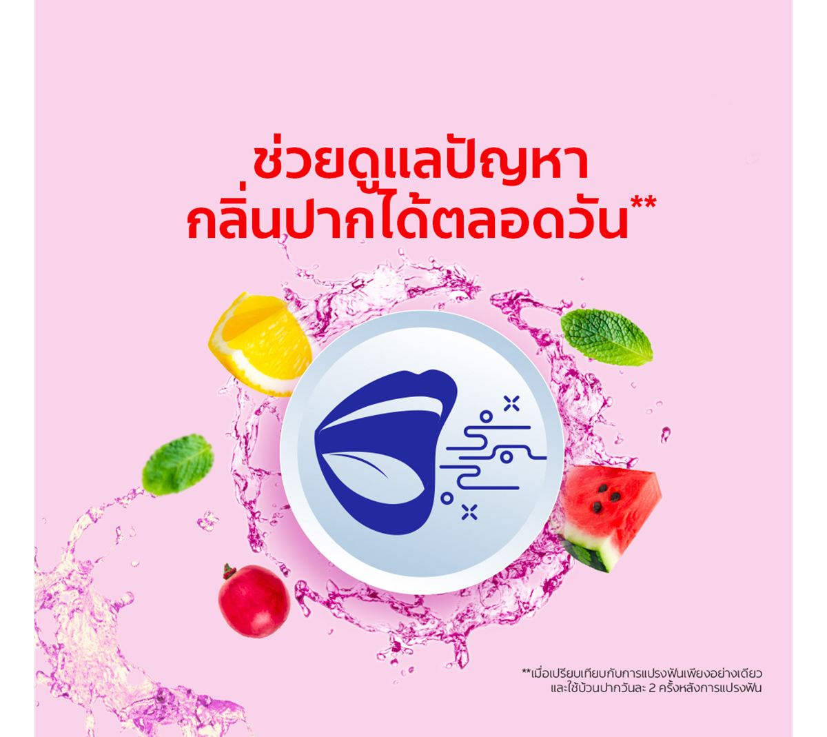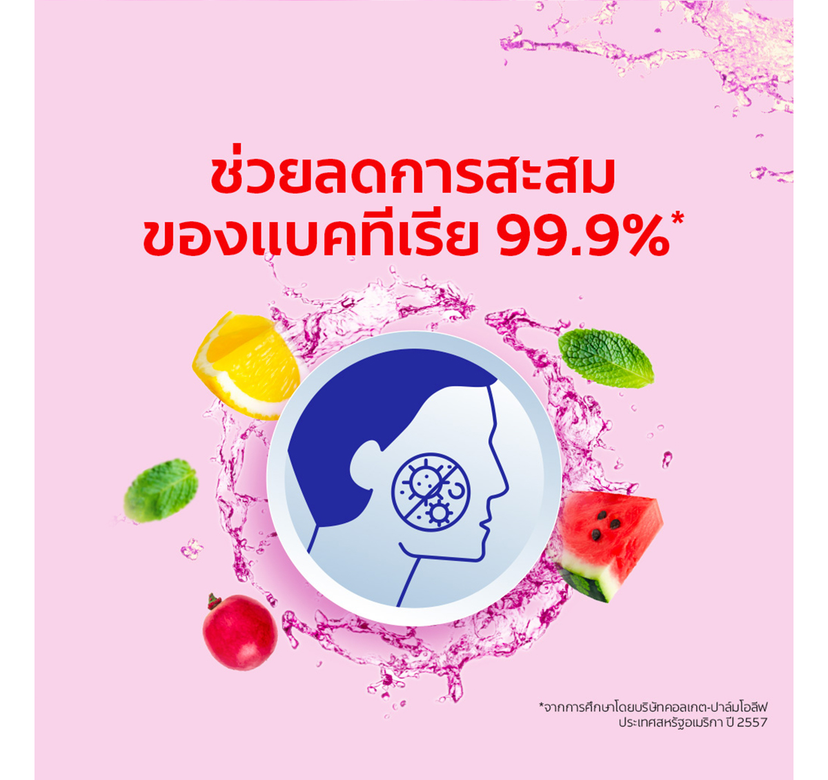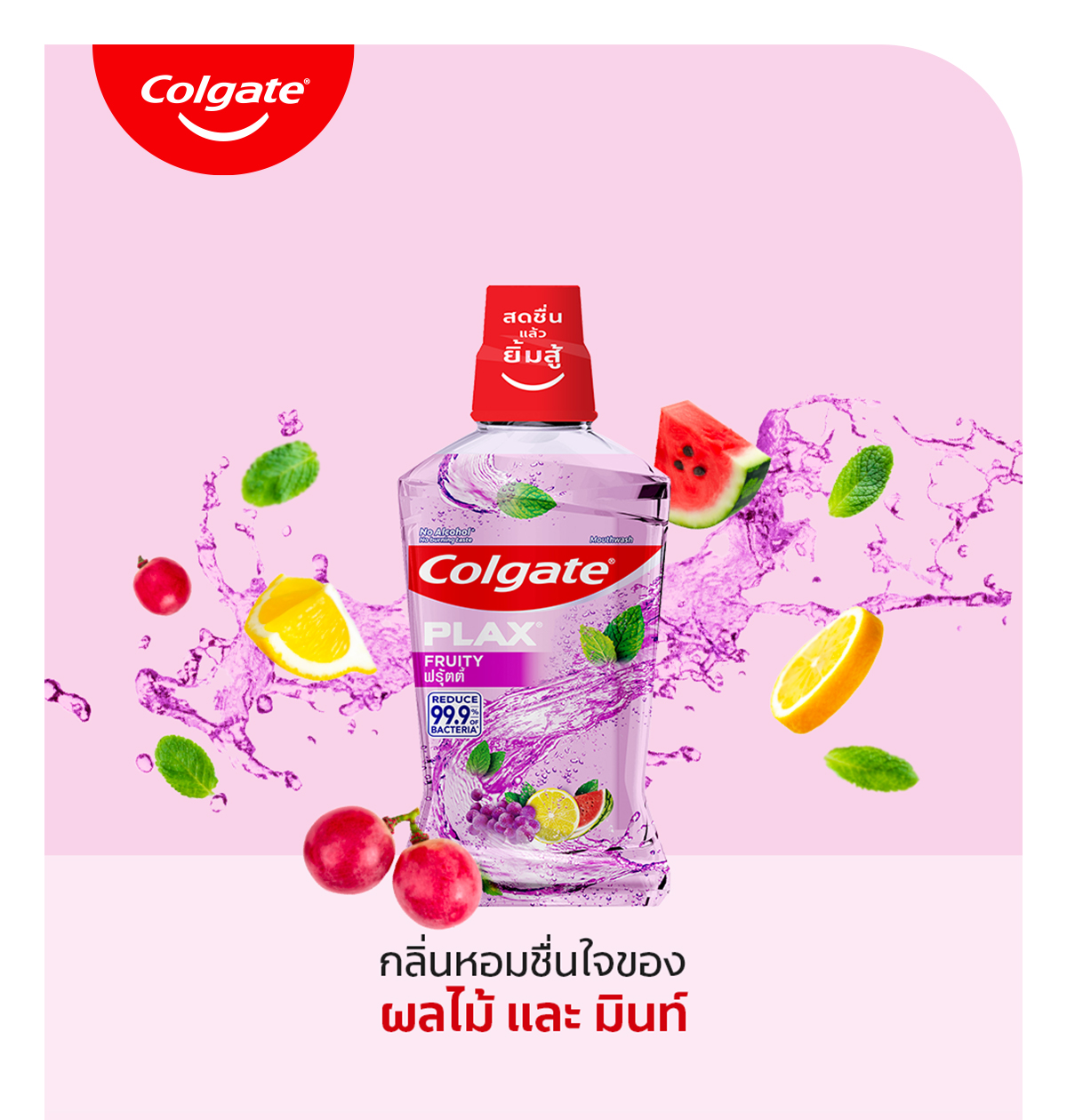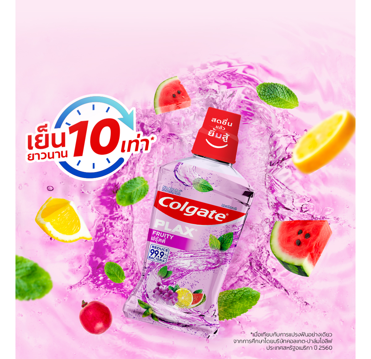 คอลเกต พลักซ์ น้ำยาบ้วนปาก ฟรุ้ตตี้ เย็นยาวนานกว่าแปรงฟันอย่างเดียว 10 เท่า สูตร 0 แอลกอฮอล์ ไม่แสบปาก ใช้หลังการแปรงฟันเพื่อให้สดชื่นยาวนานนิ่งขึ้น - ช่วยลดการสะสมแบคทีเรีย 99.9 - ช่วยลดกลิ่นปากยาวนาน - ช่วยป้องกันฟันผุด้วยฟลูออไรด์ - เพื่อสุขภาพเหงือกที่ดียิ่งขึ้น - ช่วยลดการสะสมของ แบคทีเรีย 99.9 จากการศึกษาโดยบริษัทคอลเกต - ปาล์มโอลีฟ ประเทศสหรัฐอเมริกาปี 2560 จากการศึกษาทางคลินิกในอาสาสมัครจำนวน 28 คน อายุระหว่าง 18 - 64 ปี มี.ค. - เม.ย. 2557 บริษัทคอลเกต - ปาล์มโอลีฟ ประเทศสหรัฐอเมริกา เมื่อบ้วนปาก หลังตื่นนอน ก่อนการแปรงฟัน เมื่อเปรียบเทียบกับน้ำยาบ้วนปากที่ไม่มีส่วนผสมของสารระงับเชื้อ จากการศึกษาโดยบริษัท คอลเกต - ปาล์มโอลีฟ ประเทศสหรัฐอเมริกา ปี 2560