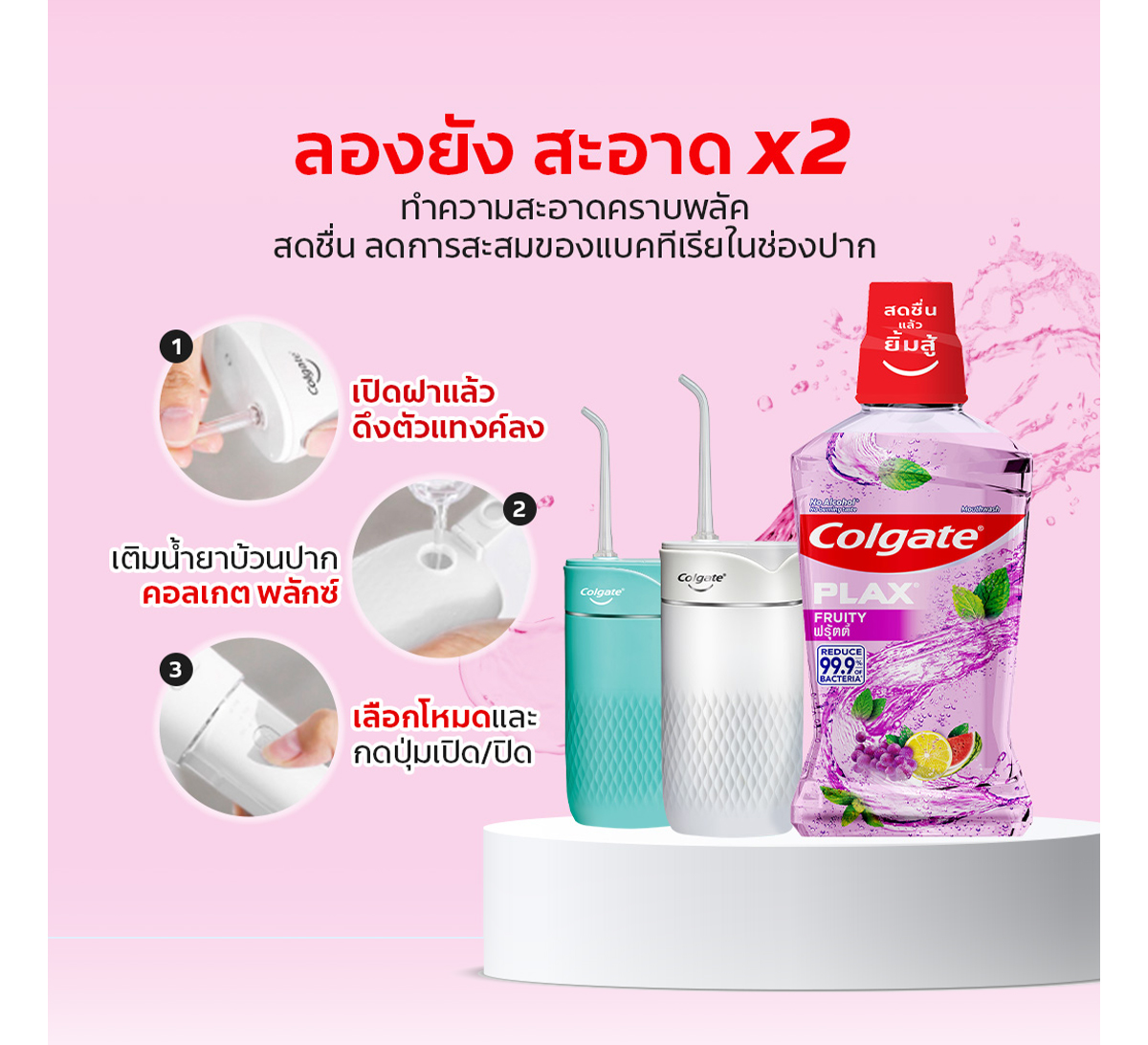 เพิ่มความมั่นใจด้วยคอลเกตพลักซ์ใช้ 2 ครั้งต่อวัน หลังการแปรงฟัน เทใส่ฝาปริมาณ 20 มล. กลั้วปากนาน 30 วินาที แล้วบ้วนทิ้ง ห้ามกลืน