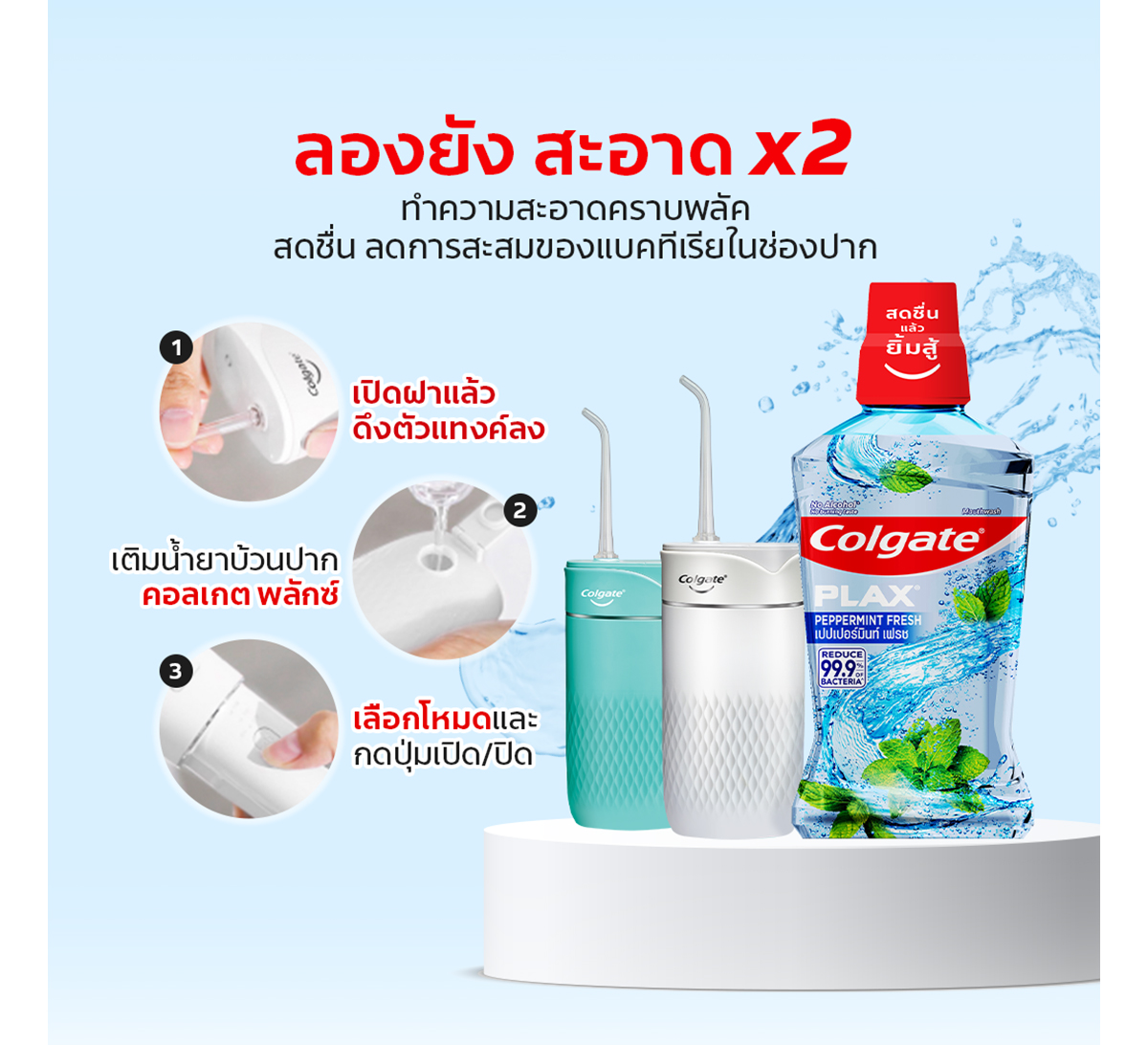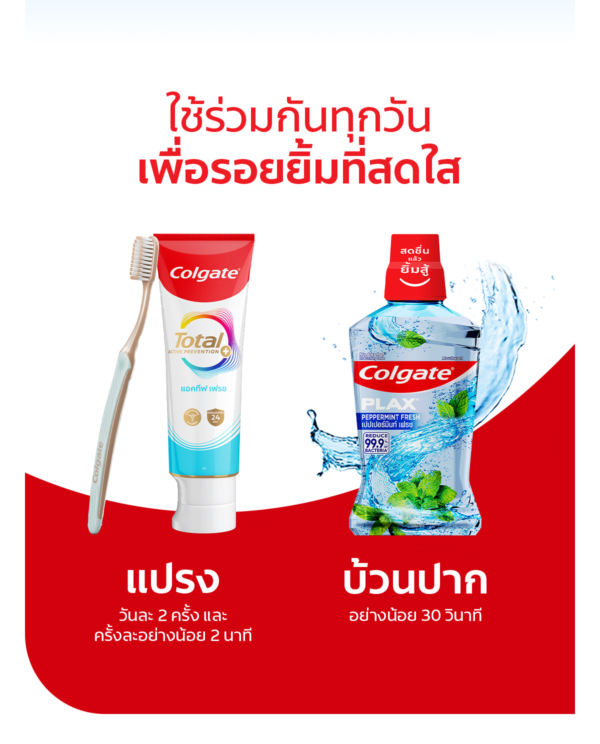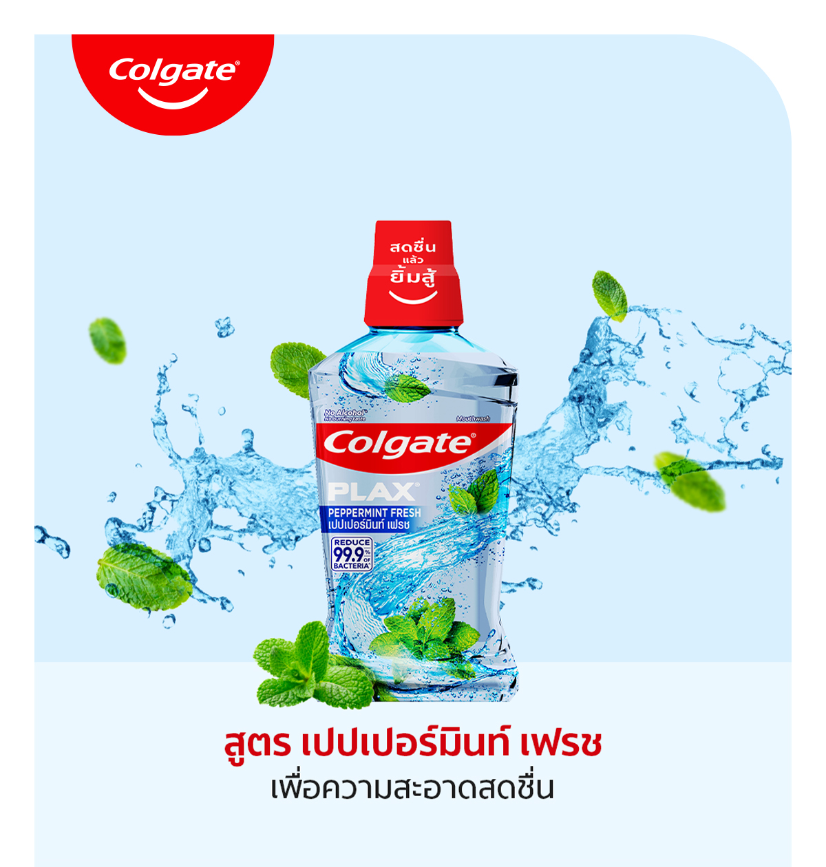 คอลเกต พลักซ์ น้ำยาบ้วนปาก เปปเปอร์มินท์ เฟรช สูตรที่ขายดีที่สุดของคอลเกต พลักซ์ - เย็นยาวนานกว่าแปรงฟันอย่างเดียว 10 เท่า - สูตร 0 แอลกอฮอล์ ไม่แสบปาก ใช้หลังการแปรงฟันเพื่อให้สดชื่นยาวนานนิ่งขึ้น - ช่วยลดการสะสมแบคทีเรีย 99.9 - ช่วยลดกลิ่นปากยาวนาน - ช่วยป้องกันฟันผุด้วยฟลูออไรด์ - เพื่อสุขภาพเหงือกที่ดียิ่งขึ้น - ช่วยลดการสะสมของ แบคทีเรีย 99.9 จากการศึกษาโดยบริษัทคอลเกต-ปาล์มโอลีฟ ประเทศสหรัฐอเมริกาปี 2560 จากการศึกษาทางคลินิกในอาสาสมัครจำนวน 28 คน อายุระหว่าง 18-64 ปี มี.ค.-เม.ย. 2557 บริษัทคอลเกต-ปาล์มโอลีฟ ประเทศสหรัฐอเมริกา เมื่อบ้วนปาก หลังตื่นนอน ก่อนการแปรงฟัน เมื่อเปรียบเทียบกับน้ำยาบ้วนปากที่ไม่มีส่วนผสมของสารระงับเชื้อ จากการศึกษาโดยบริษัท คอลเกต-ปาล์มโอลีฟ ประเทศสหรัฐอเมริกา ปี 2560 เพิ่มความมั่นใจด้วยคอลเกตพลักซ์ใช้ 2 ครั้งต่อวัน หลังการแปรงฟัน เทใส่ฝาปริมาณ 20 มล. กลั้วปากนาน 30 วินาที แล้วบ้วนทิ้ง ห้ามกลืน