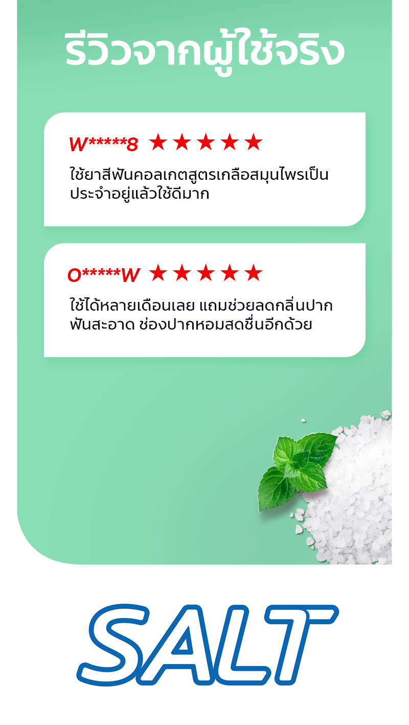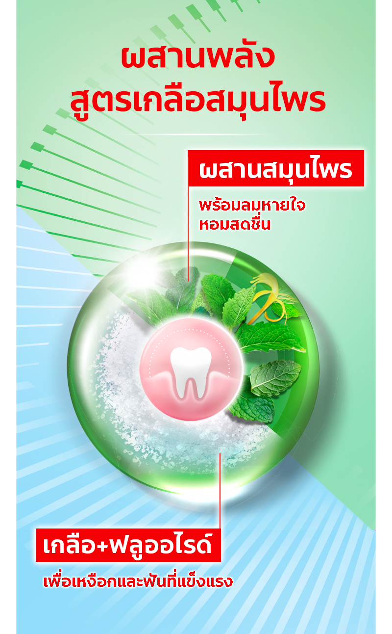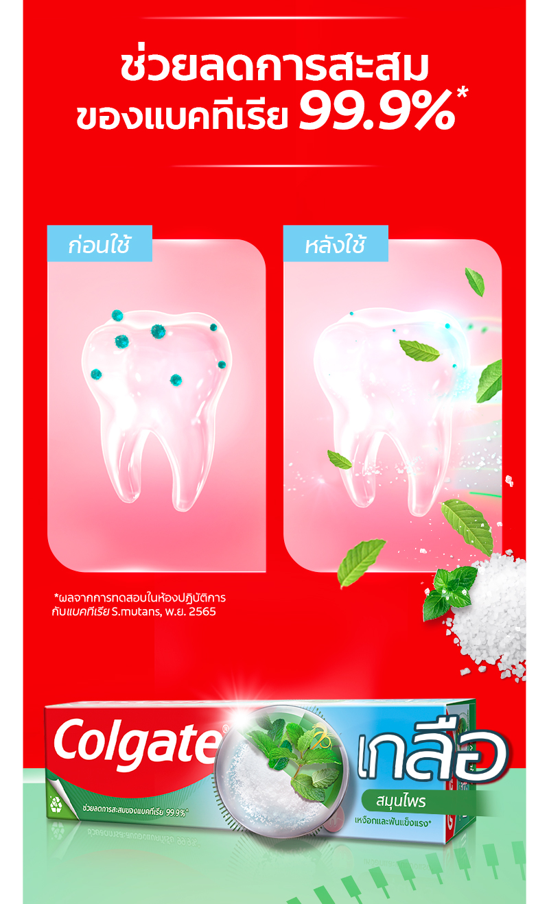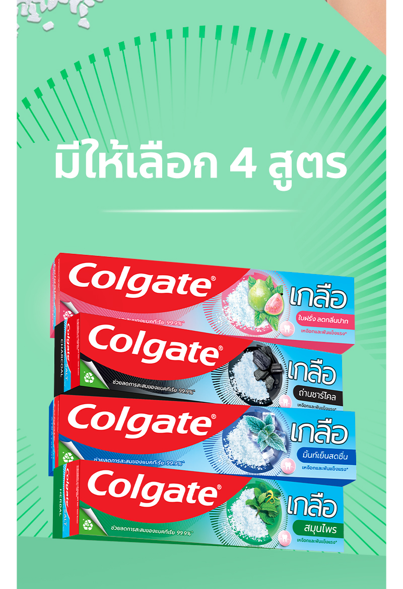 ยาสีฟันคอลเกตเกลือสมุนไพรและฟลูออไรด์ ช่วยลดการสะสมของคราบแบคทีเรีย อันเป็นสาเหตุหนึ่งของปัญหาสุขภาพเหงือกและฟันที่ดี ยาสีฟันคอลเกตเกลือสมุนไพร ผสานพลังอย่างแม่นยำของสูตรเกลือสมุนไพร