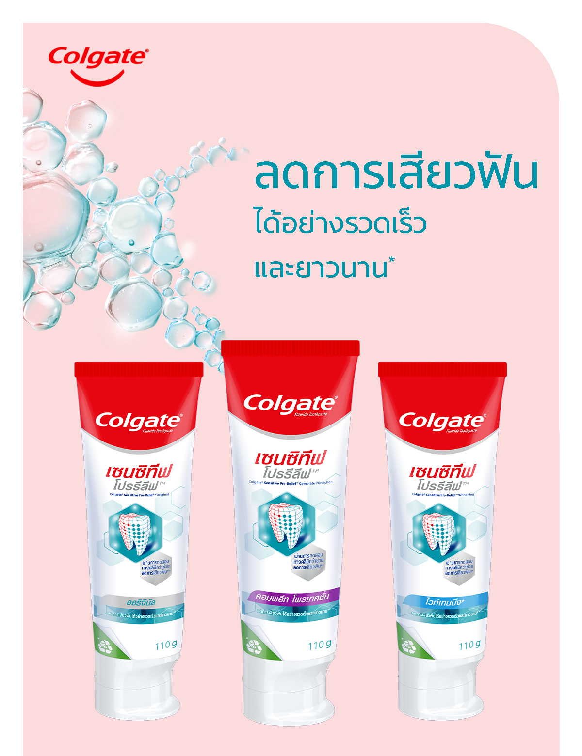 คอลเกต เซนซิทีฟ โปรรีลีฟ ป้องกันการเสียวฟันโดยการอุดช่องทางที่นำไปสู่ประสาทที่มีการเสียวฟันและทำให้ความเย็นและความร้อนไม่สามารถส่งผ่านเข้าถึงเนื้อฟันชั้นในได้ และสร้างเกราะป้องกันการเสียวฟันได้ยาวนานเมื่อใช้เป็นประจำ ช่วยขจัดคราบอย่างมีประสิทธิภาพเพื่อฟันขาวอย่างเป็นธรรมชาติ คอลเกต เซนซิทีฟ โปรรีลีฟ ป้องกันการเสียวฟันโดยการอุดช่องทางที่นำไปสู่ประสาทที่มีการเสียวฟันและทำให้ความเย็นและความร้อนไม่สามารถส่งผ่านเข้าถึงเนื้อฟันชั้นในได้ และสร้างเกราะป้องกันการเสียวฟันได้ยาวนานเมื่อใช้เป็นประจำ ช่วยขจัดคราบอย่างมีประสิทธิภาพเพื่อฟันขาวอย่างเป็นธรรมชาติ