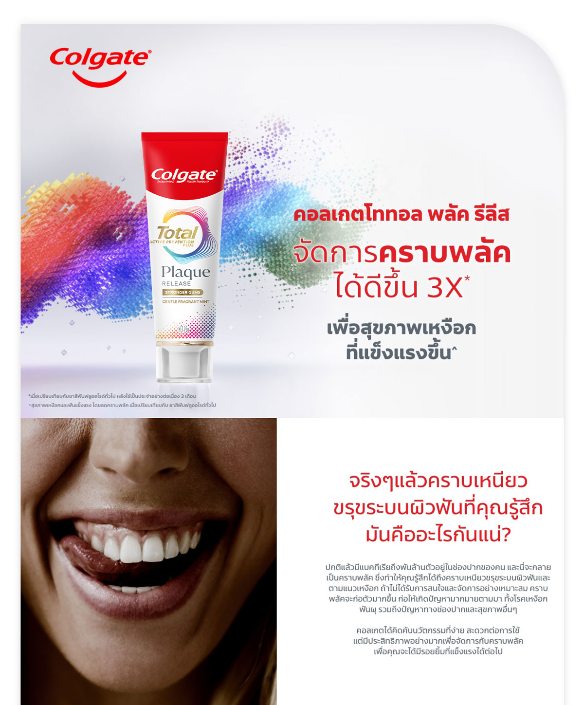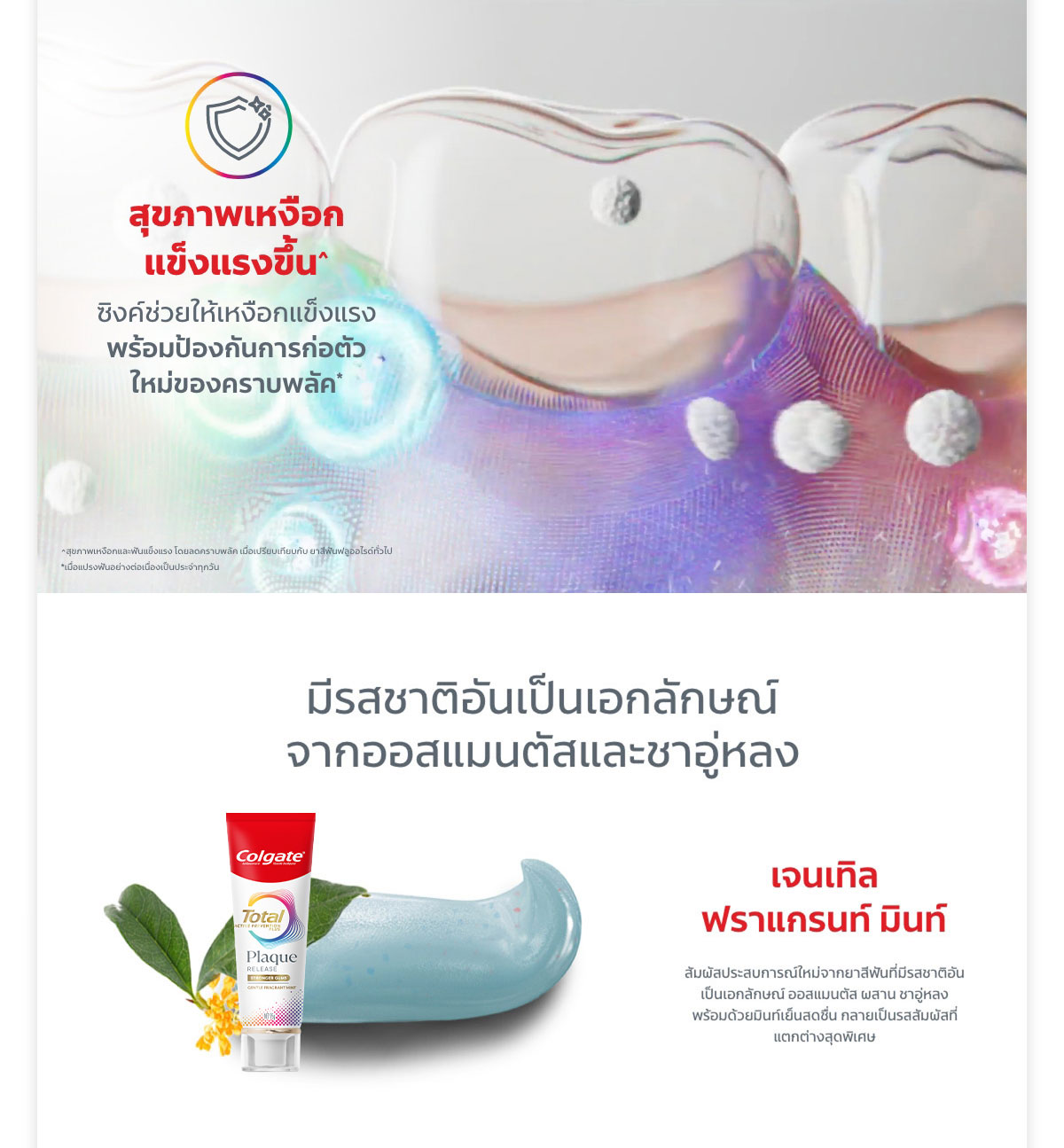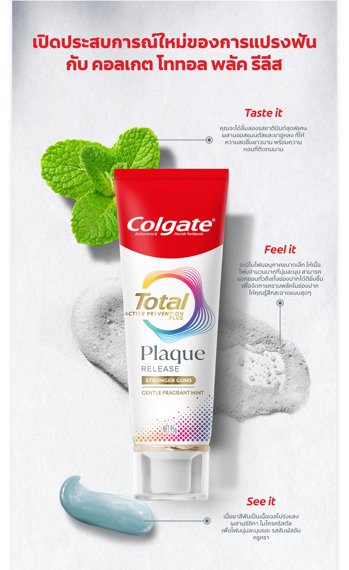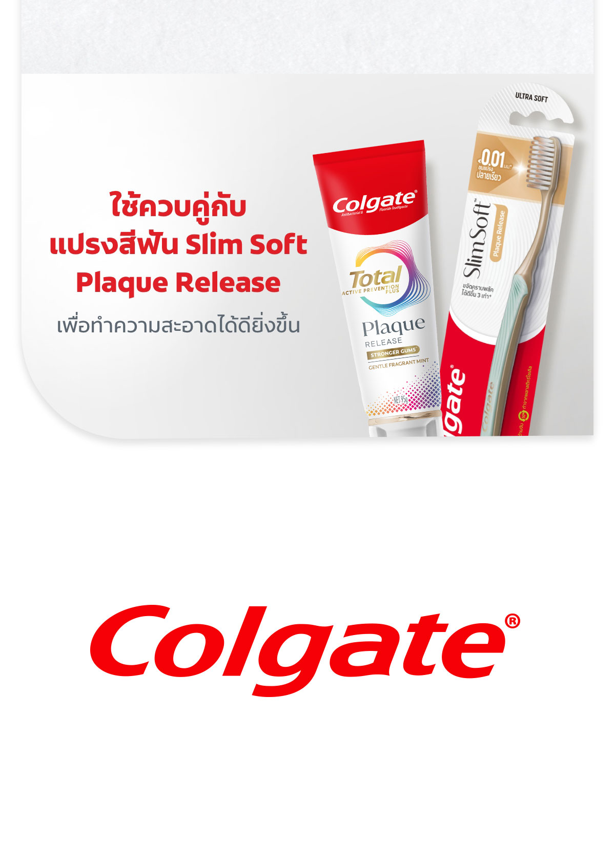 คอลเกต ยาสีฟัน โททอล พลัค รีลีส จัดการคราบพลัคได้ดีขึ้น 3X เพื่อสุขภาพเหงือกที่แข็งแรงขึ้น ยาสีฟัน โททอล พลัค รีลีส ผสานอะมิโนโฟม แอนด์ ซิงค์ มิเนอรัลส์ ช่วยจัดการคราบพลัคได้อย่างอ่อนโยน แต่มีประสิทธิภาพ สามารถจัดการคราบพลัคได้ดีขึ้น 3X เพื่อสุขภาพเหงือกที่แข็งแรงขึ้น พร้อมให้คุณสัมผัสประสบการณ์ใหม่ในการแปรงฟันไปกับโฟมนุ่มละมุน รสหอมหมื่นลี้และชาอู่หลง และความเย็นสดชื่น เมื่อเปรียบเทียบกับยาสีฟันฟลูออไรด์ทั่วไป หลังใช้เป็นประจำอย่างต่อเนื่อง 3 เดือน สุขภาพเหงือกและฟันแข็งแรง โดยลดคราบพลัค เมื่อเปรียบเทียบกับ ยาสีฟันฟลูออไรด์ทั่วไป แปรงฟันด้วยคอลเกต ยาสีฟัน สมุนไพร ดีท็อกซ์ สูตรเข้มข้น อย่างน้อยวันละ 2 ครั้ง หรือตามทันตแพทย์แนะนำ และบ้วนปากหลังการแปรงฟัน