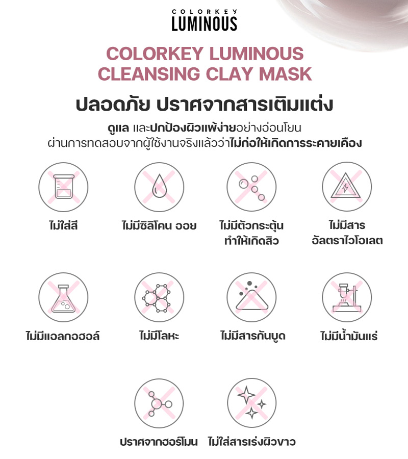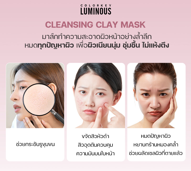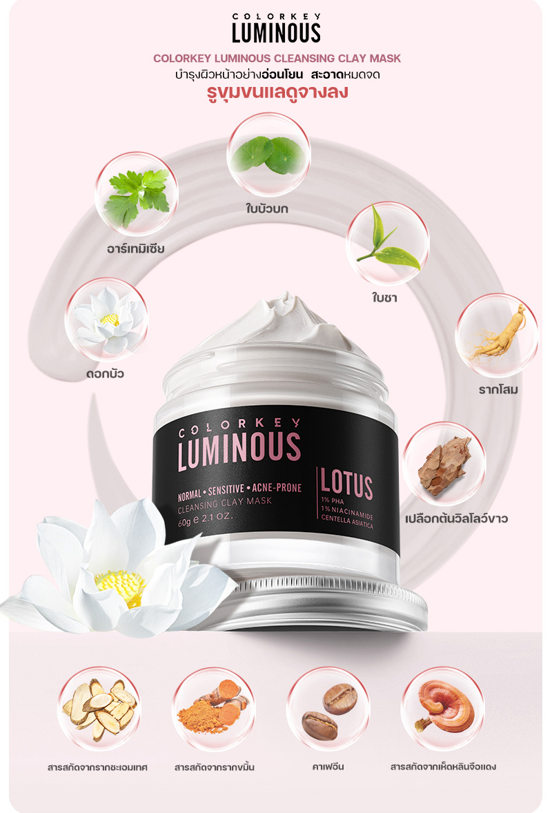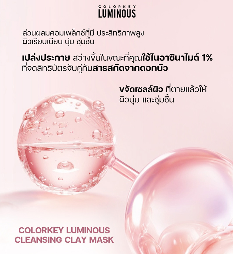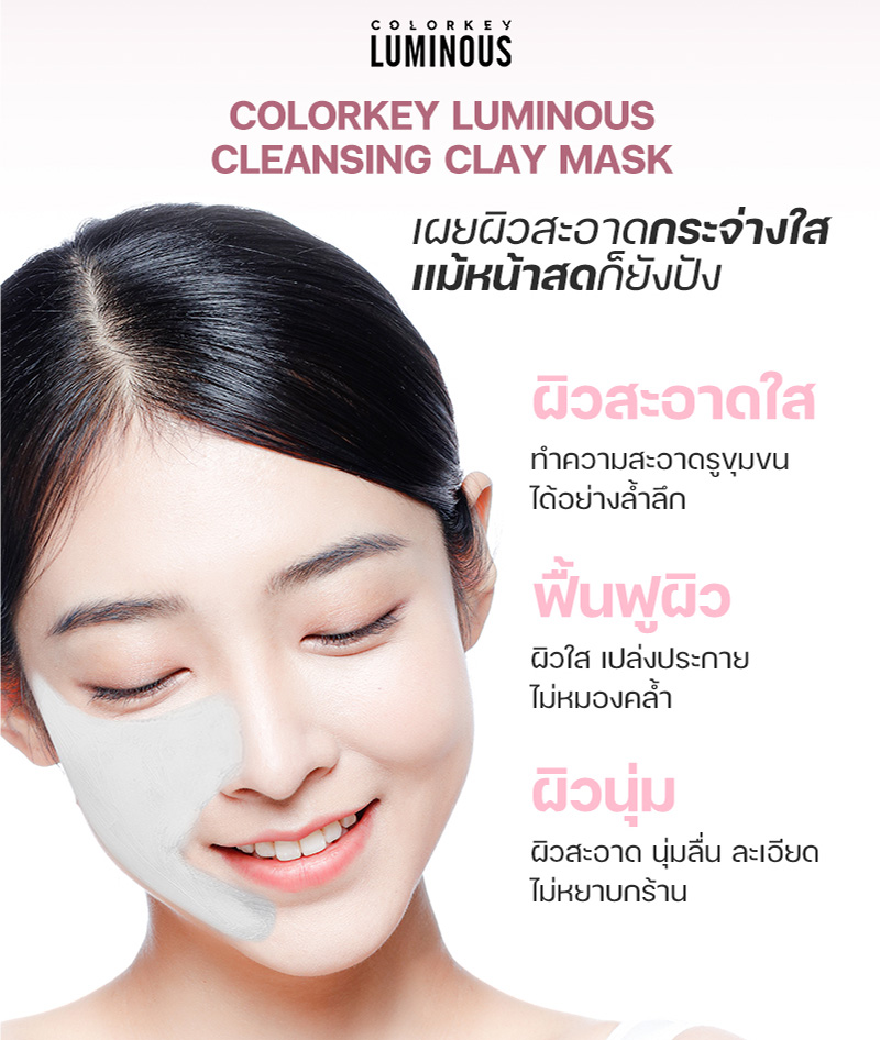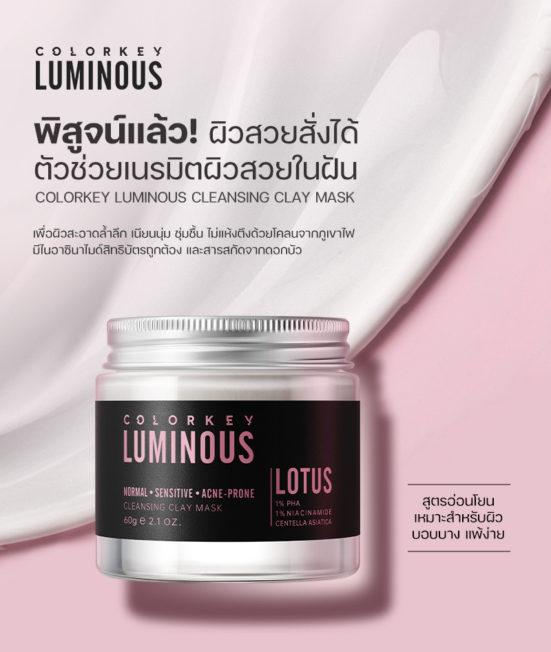Colorkey Luminous Cleansing Clay Mask มาส์กโคลนภูเขาไฟผสมสารสกัดจากดอกบัว เพื่อการทำความสะอาดอย่างล้ำลึก เรียบเนียน และชุ่มชื้น สูตรอ่อนโยนนี้เหมาะอย่างยิ่งสำหรับผิวแพ้ง่ายและผิวแห้ง เพื่อผิวที่สะอาดล้ำลึก เรียบเนียน และชุ่มชื้น โดยไม่รู้สึกตึงหรือแห้ง มาส์กโคลนภูเขาไฟนี้ประกอบด้วยไนอาซินาไมด์ที่ได้รับการจดสิทธิบัตรและสารสกัดจากดอกบัว ช่วยลดความหยาบกร้าน และความหมองคล้ำ ขจัดเซลล์ผิวที่ตายแล้ว และฟื้นคืนความเปล่งปลั่ง สูตรอ่อนโยนนี้เหมาะสำหรับผิวบอบบางและระคายเคืองง่าย ปราบสิว ผิวมัน กระชับรูขุมขน อุดมไปด้วยสารสกัดจากชาเขียว และโคลนจากธรรมชาติ มาส์กได้นาน ผิวไม่แห้งตึง ล้างออกง่ายด้วยน้ำเปล่า ทำความสะอาดรูขุมขนอย่างล้ำลึก สะอาดหมดจด