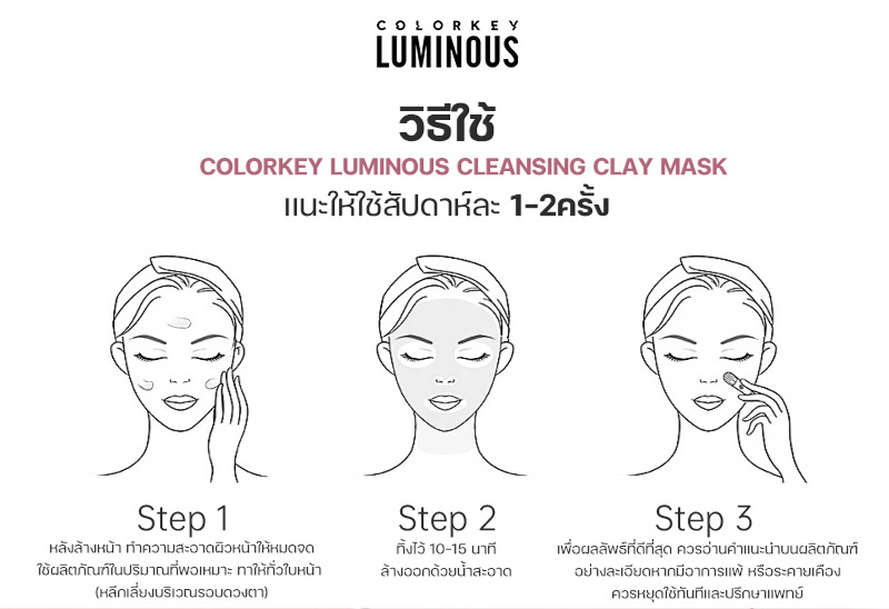 แนะนำให้ใช้ 1-2 ครั้งต่อสัปดาห์ ล้างหน้าให้สะอาด ทา Cleansing Clay Mask ทั่วใบหน้าในปริมาณที่พอเหมาะ (หลีกเลี่ยงบริเวณรอบดวงตา) ทิ้งไว้ 10-15 นาทีล้างออกด้วยน้ำสะอาด ใช้คอตตอนบัดค่อยๆ เช็ดสิ่งสกปรกที่อุดตันออกมา