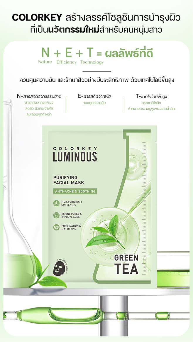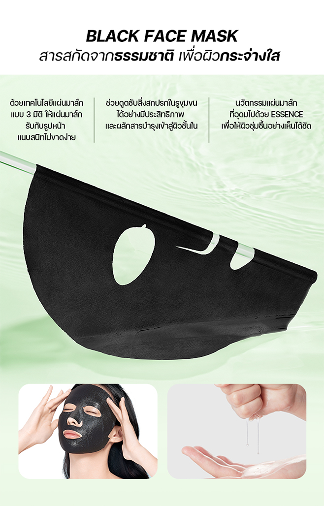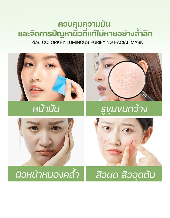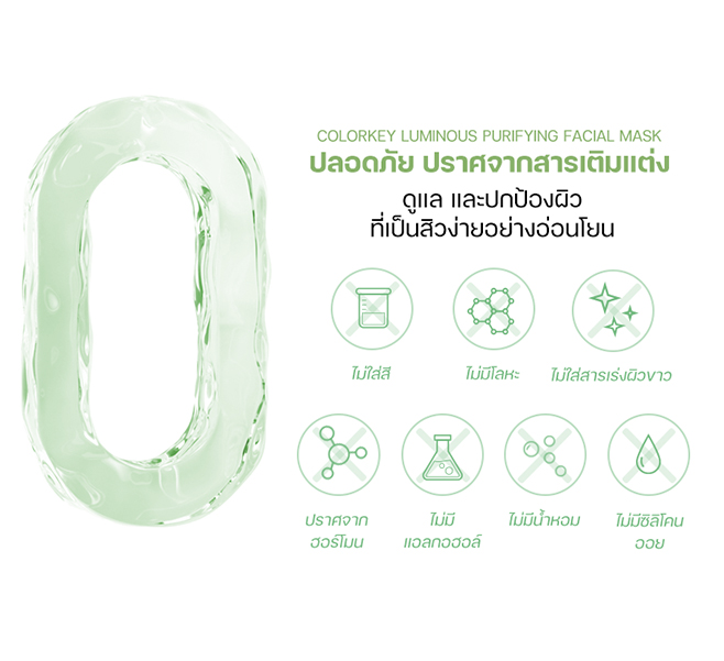 Colorkey Luminous Purifying Facial Mask 25 มล. 1 ชิ้น ส่วนผสมหลักและสรรพคุณ มาส์กบำรุงผิว ช่วยเพิ่มความชุ่มชื้นและปลอบประโลมผิว ทำความสะอาดความมันส่วนเกินและซีบัม ช่วยป้องกันสิว ลดเลือนจุดด่างดำ และปรับสีผิวให้สม่ำเสมอ เผยผิวกระจ่างใส เรียบเนียน นุ่มดุจแพรไหม สารสกัดจากชาเขียว ผ้า Tencel สีดำ ดูดซับสิ่งสปรก ลดการเกิดสิว ไม่มีสี ไม่มีซิลิโคนออย ไม่มีตัวกระตุ้นทำให้เกิดสิว ไม่มีสารอัลตราไวโอเลต ไม่มีแอลกอฮอล์ ไม่มีโลหะ ไม่มีสารกันบูด ไม่มีน้ำมันแร่ ปราศจากฮอร์โมน ไม่มีสารเร่งผิวขาว ดูแลผิวได้ทุกวัน ตอบโจทย์ทุกปัญหาผิว