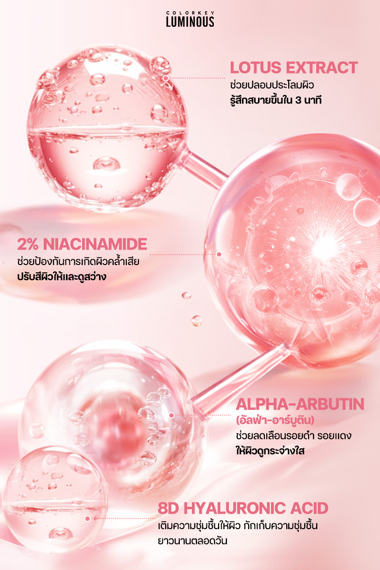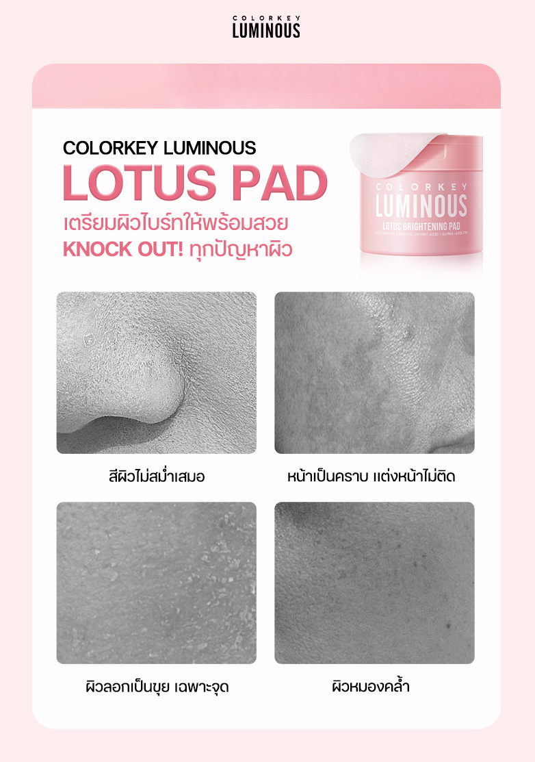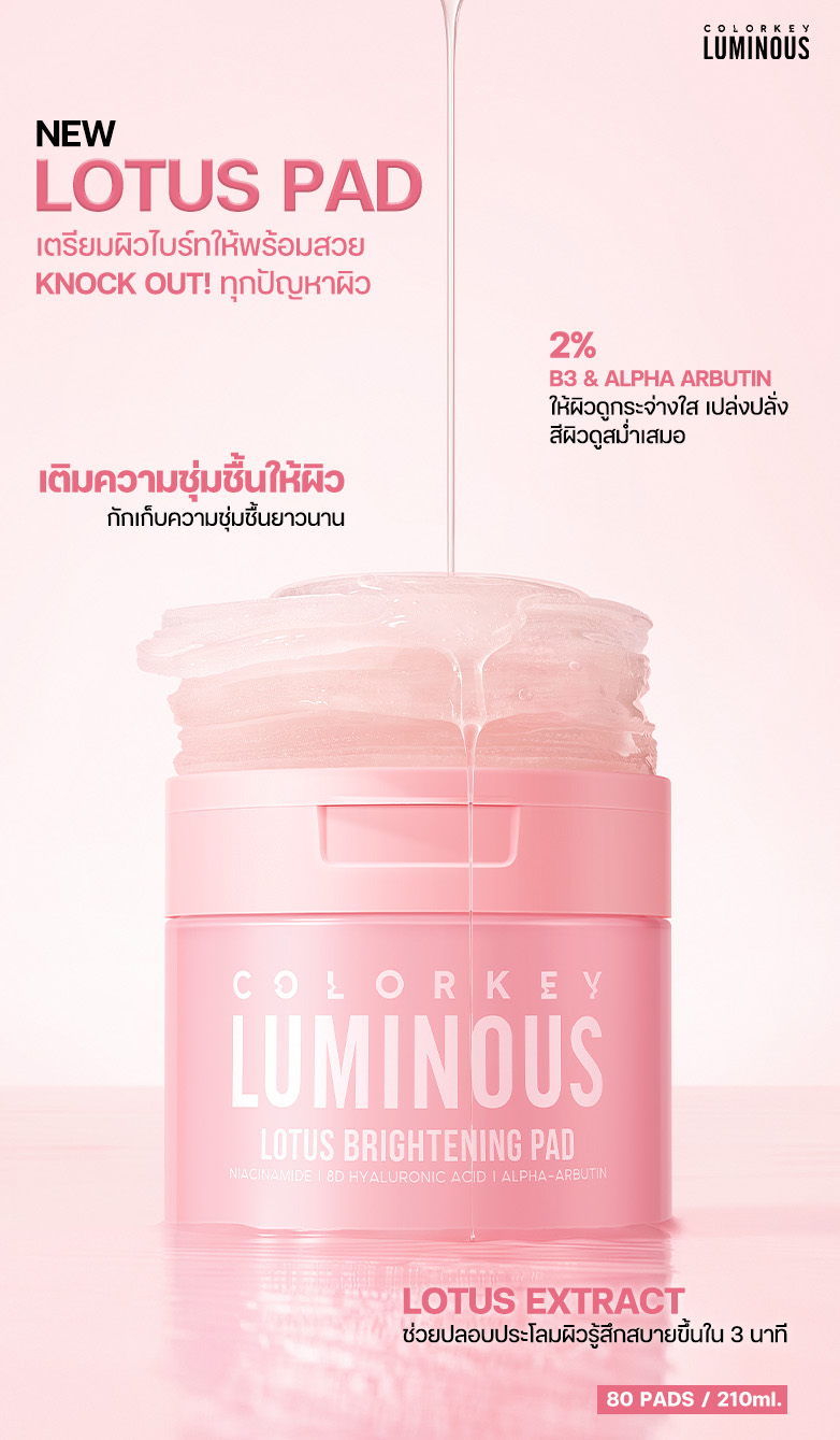 Colorkey Luminous Lotus Pad (สีชมพู) นวัตกรรมแผ่นเจลเกาะผิว สารสกัดแน่น ซึมง่ายไม่เหนอะหน้าสูตร Lotus Brightening เพื่อผิวแลดูกระจ่างใส เปล่งปลั่ง สีผิวดูสม่ำเสมอ ด้วยสารสกัดจากดอกบัว เอกสิทธิ์เฉพาะของ Colorkey Luminous ช่วยลดปัญหาผิวหน้าแห้ง เพื่อผิวเนียนนุ่มชุ่มชื้นตลอดวัน นวัตกรรมแผ่นเจลเกาะผิว สารสกัดแน่น ซึมง่ายไม่เหนอะหน้า สูตร Lotus Brightening เพื่อผิวแลดูกระจ่างใส เปล่งปลั่ง สีผิวดูสม่ำเสมอ ด้วยสารสกัดจากดอกบัว เอกสิทธิ์เฉพาะของ Colorkey Luminous ช่วยลดปัญหาผิวหน้าแห้ง เพื่อผิวเนียนนุ่มชุ่มชื้นตลอดวัน