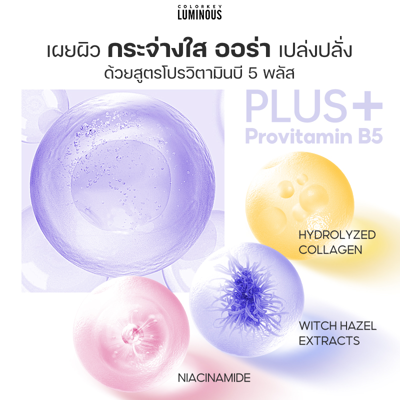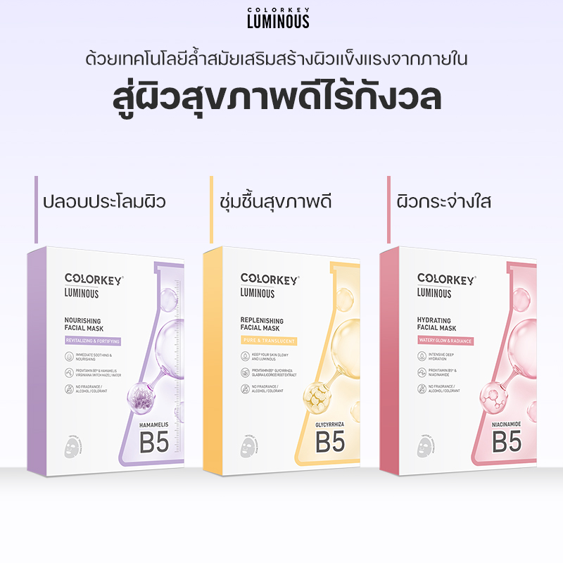 Colorkey Luminous Hydrating Mask 25ml 1 piece. quickly hydrates the skin, making it smooth and soft immediately after use. The product helps improve dry skin and wrinkles, supporting skin regeneration.The core ingredients are Provitamin B5 and snow lotus. Deeply moisturizes the skin and helps stabilize the skin deeply moisturizes and nourishes the skin, creating healthy skin, making the skin bright and white.The mask is thin and light, hugging the face to help nutrients penetrate deep into each cell.The Colorkey Luminous B5 mask line has the following products Nourishing Purple Balances water and oil, minimizes pores Replenishing Yellow Improves dry skin and wrinkles, supports skin regeneration Hydrating Pink Improves dull skin and whitens Regenerating Reddish brown Supports hydration, helps skin to be plump and firm Brightening Blue Supports skin brightening, helps to deeply moisturize
