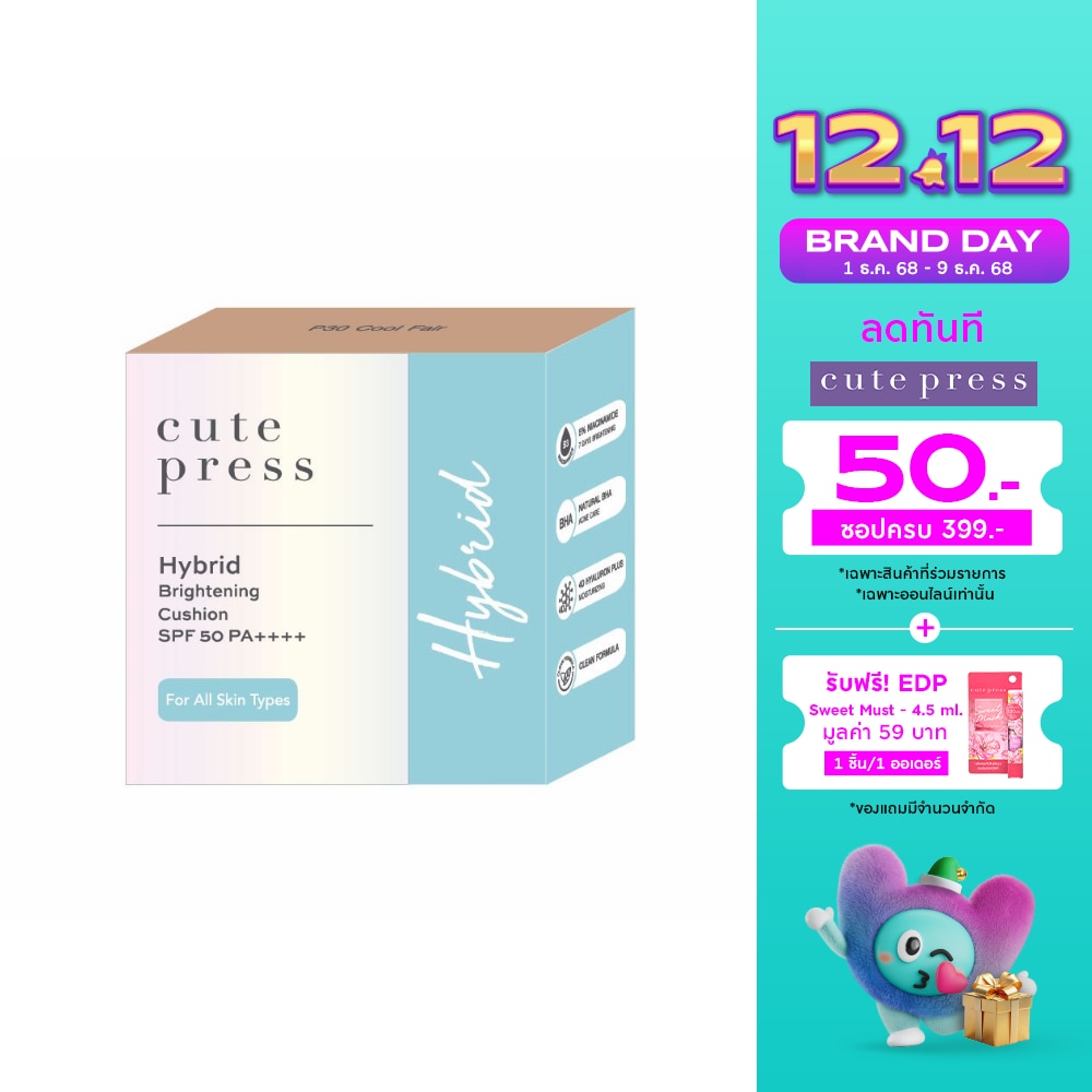 ครั้งแรกกับคุชชั่นไฮบริดสูตรคลีนที่ดีที่สุดจากคิวท์เพรส ที่นำ Niacinamide มากถึง 5 มาผสานเข้าในรองพื้นคุชชั่น ให้ผิวคุณสวยขึ้นได้จริงในทุกๆวันที่แต่งหน้า พิสูจน์แล้วว่าผิวแลดูกระจ่างใสขึ้นในเPยง 1 สัปดาห์แม้ไม่ทาสกินแคร์ ควบคุมความมันนาน 12 ชั่วโมง พร้อม Natural BHA ที่ช่วยลดโอกาสการเกิดสิว เนื้อสัมผัสบางเบาสบายผิวแต่ให้การปกปิดดีเยี่ยม สูตรติดทนนาน สีไม่ดรอปตลอดวัน กันน้ำกันเหงื่อ ยิ่งเหงื่อออกผิวยิ่งสวย และปกป้องผิวจากแสงแดดด้วยค่า SPF 50 PA++++ เพื่อตอบโจทย์คนเมืองร้อน ให้คุณเผยผิวสวยสุขภาพดีอย่างมั่นใจ