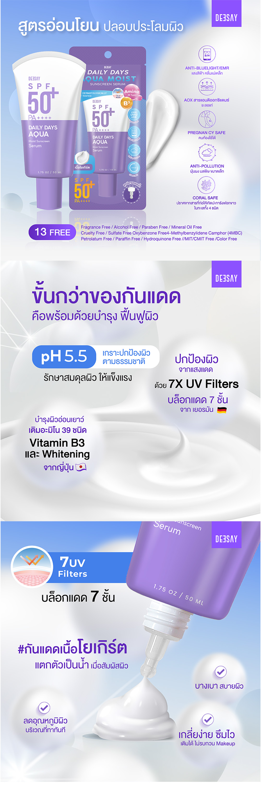 ดีเซ้ย์ เดลี่ เดย์ อควา มอยส์ ซันสกรีน เซรั่ม SPF50+ PA++++ 50มล.