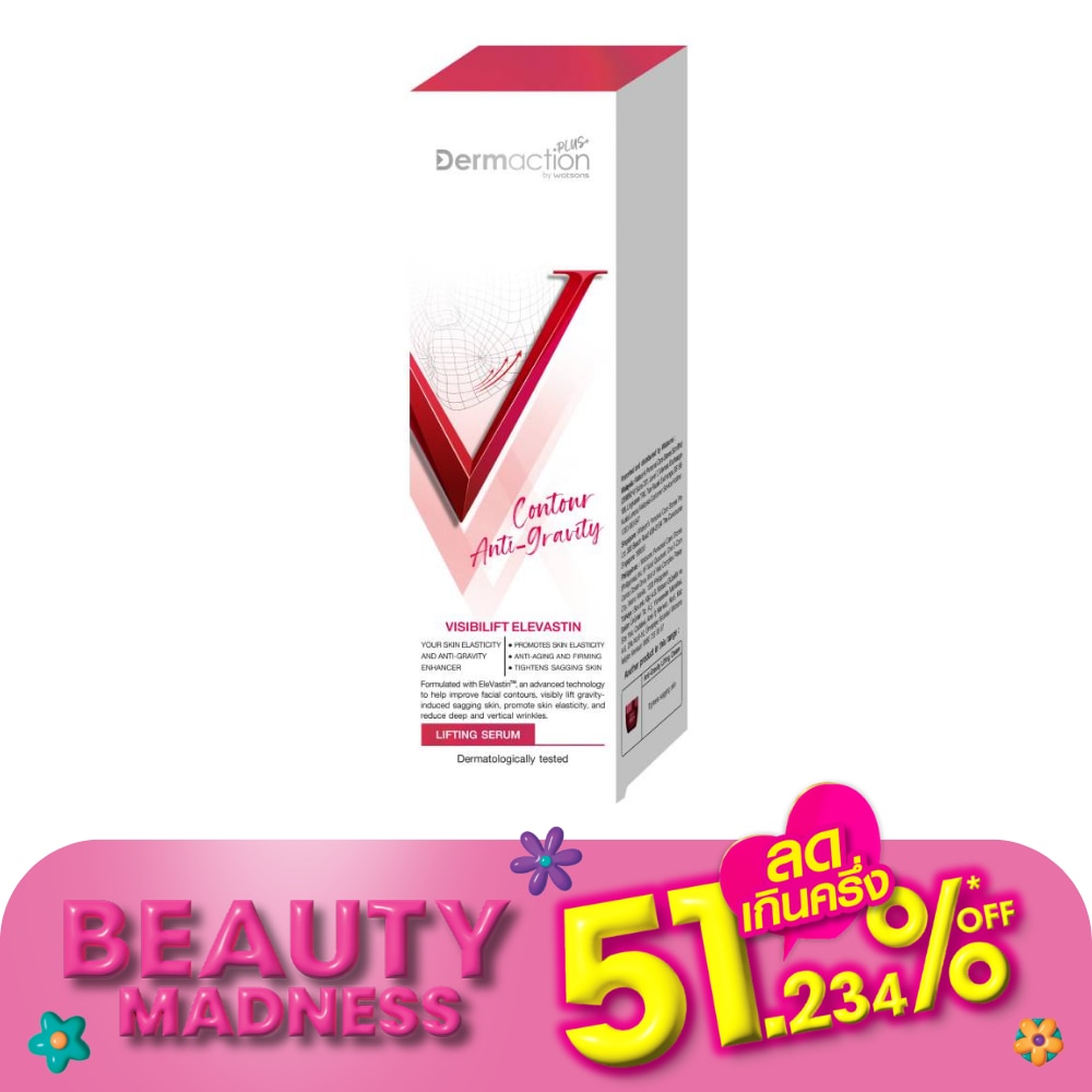 เดอมาแอคชัน พลัส บาย วัตสัน คอนทัวร์ แอนไท-กราวิตี้ ลิฟติ้ง เซรั่ม เซรั่มเนื้อบางเบาสูตรพิเศษ ด้วยเทคโนโลยี EleVastinTM ช่วยให้ผิวหน้าแลดูกระชับ พร้อมด้วย DermahyalTM และ 8 HYA CPX ช่วยเพิ่มความชุ่มชื้น ฟื้นบำรุงผิวให้แลดูอ่อนเยาว์ เนียนเรียบ สม่ำเสมอ สีของผลิตภัณฑ์อาจเปลี่ยนแปลงได้ เนื่องจากมีส่วนผสมจากธรรมชาติซึ่งไม่ส่งผลต่อคุณภาพของผลิตภัณฑ์ ปราศจากส่วนผสมที่ไม่พึงประสงค์ 20 ชนิด นอกจากนี้บรรจุภัณฑ์ขวดยังผลิตจากพลาสติกที่ผ่านการรีไซเคิล (20 PCR plastic) และกล่องกระดาษได้รับการรับรองจาก FSC.