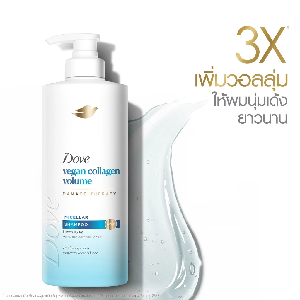 แชมพู วีแกน คอลลาเจน วอลลุ่ม ไมเซลลาร์ แดเมจ เทอราพี Vegan Collagen Volume Micellar Damage Therapy สำหรับเพิ่มวอลลุ่มจากคอลลาเจนวีแกนของโดฟถูกพัฒนา สูตรด้วยคอลลาเจนวีแกน ซึ่งช่วยบำรุงเส้นผมให้มีลุคที่ดูฟูเป็นธรรมชาติ แชมพูเพิ่มวอลลุ่มจากคอลลาเจนวีแกนของโดฟมอบปริมาณผม 3 เท่า สำหรับความนุ่มและฟูอย่างยาวนานที่อยู่ได้ทั้งวันให้ผลลัพธ์ที่ดีที่สุดเมื่อใช้เป็นระบบดูแลเส้นผมอย่างครบถ้วนร่วมกับแชมพูของโดฟ ครีมนวด ผ้าพันคอ และน้ำมัน ทดสอบกับเส้นผมที่ใช้แชมพูและครีมนวดของโดฟ เทียบกับเส้นผมที่เหนื่อยล้าและแบนราบ คอลลาเจนวีแกนหมายถึง sh-Polypeptide-121 เปปไทด์ที่สกัดจากวีแกน ซึ่งประกอบด้วยกรดอะมิโนเป็นหลักที่มีลักษณะคล้ายกับคอลลาเจนธรรมชาติ