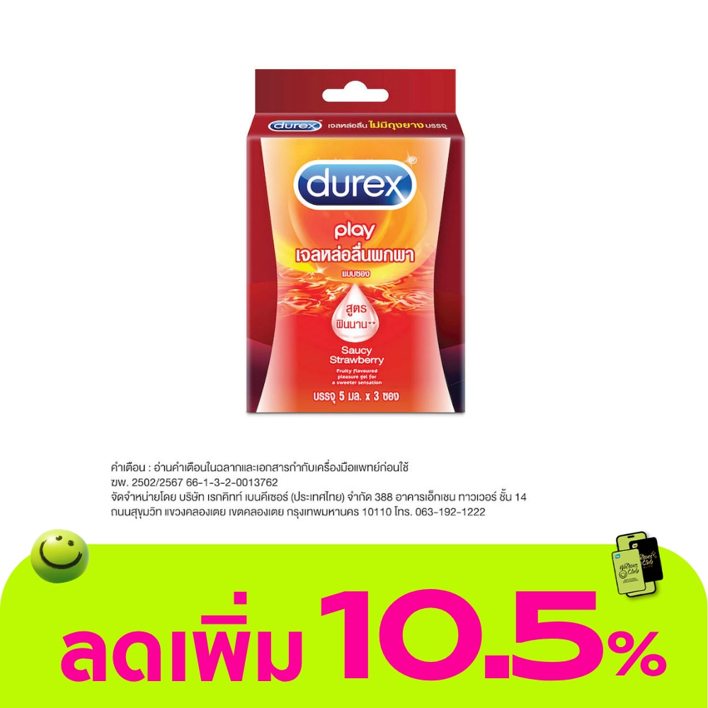 เจลหล่อลื่น ดูเร็กซ์ เพลย์ สตรอเบอร์รี่ ขนาด 5 มล. ในกล่องบรรจุ 3 ซอง ขนาดพกพา ใช้งานง่าย สะดวก สูตรอ่อนโยน สามารถใช้ร่วมกับถุงยางอนามัยได้ ฆพ.2502/2567