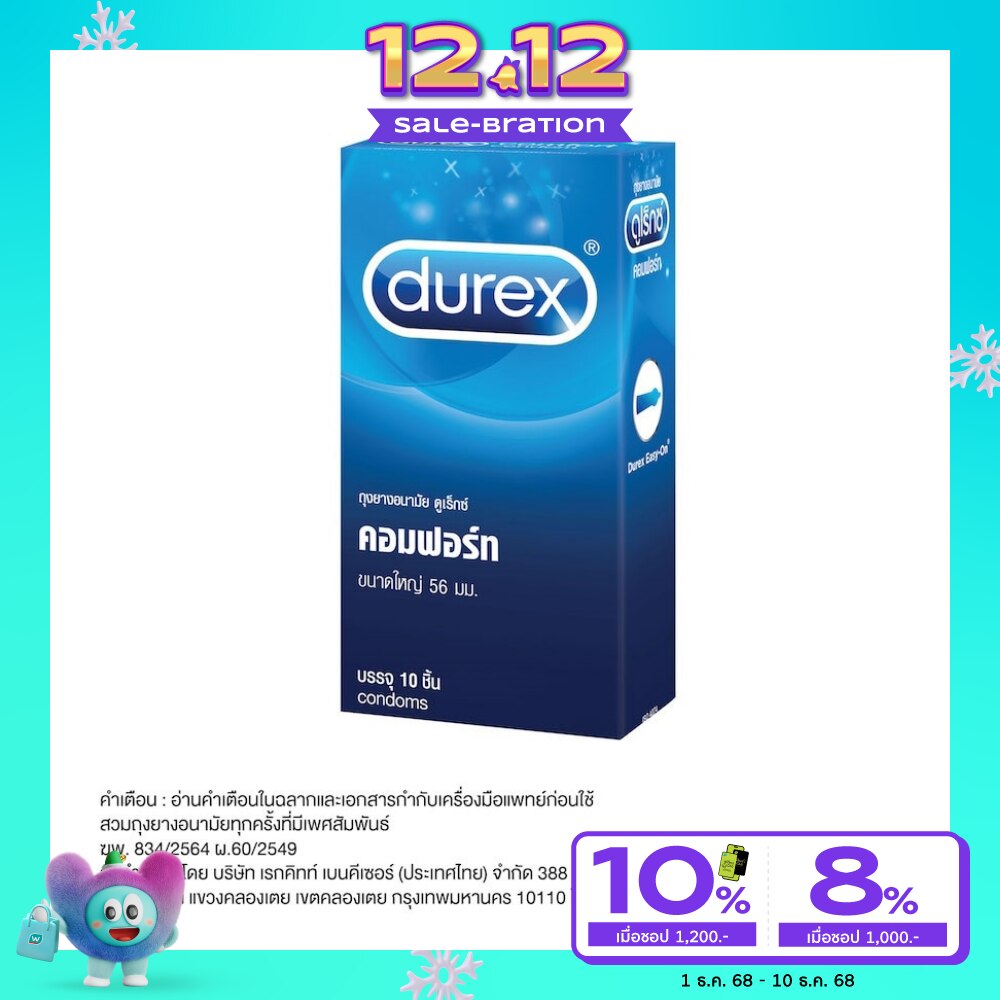 ดูเร็กซ์ คอมฟอร์ท แพคสุดคุ้ม 10 ชิ้น ถุงยางอนามัยผิวเรียบ ผนังไม่ขนาน ขนาดใหญ่ 56 มม. ผลิตจากน้ำยางธรรมชาติพร้อมเคลือบสารหล่อลื่น