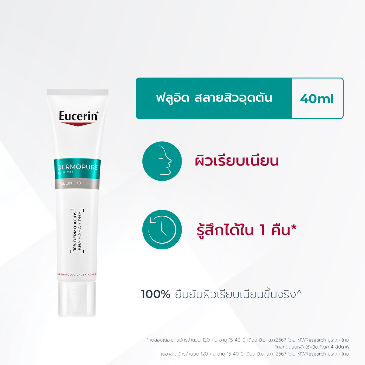 ยูเซอริน เดอร์โมเพียว คลินิคอล พีลลิ่ง 10 แนะนำสำหรับลดปัญหาสิวซ้ำซาก และฟื้นบำรุงผิวให้เรียบเนียน ปราศจากน้ำหอม ผสานส่วนผสม 10 ของ Salicylic Acid (BHA), Glycolic Acid (AHA) และ Gluconolactone (PHA) ผลัดเซลล์ผิว พร้อมเติมความชุ่มชื้นCLINICAL EFFICACY ผ่านการทดสอบทางคลินกิ ฟื้นบำรุง ผิวให้เรียบเนียนช่วงกลางคืน ลดรอยสิว ผิวดูเรียบเนียนและกระจ่างใสขึ้น อย่างเห็นได้ชัด เริ่มมลดปัญหาสิวตั้งแต่วันแรกที่ใช้ เหมาะสำหรับอายุ 12 ปีขึ้นไปและทุกสภาพผิว