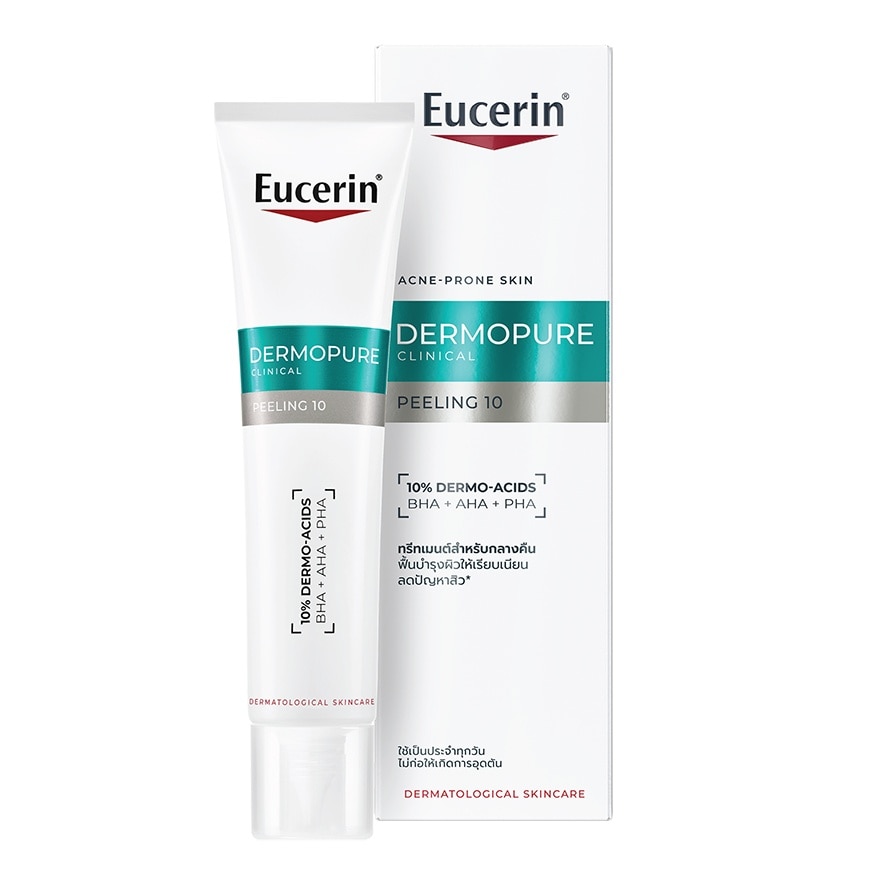 ยูเซอริน เดอร์โมเพียว คลินิคอล พีลลิ่ง 10 แนะนำสำหรับลดปัญหาสิวซ้ำซาก และฟื้นบำรุงผิวให้เรียบเนียน ปราศจากน้ำหอม ผสานส่วนผสม 10% ของ Salicylic Acid (BHA), Glycolic Acid (AHA) และ Gluconolactone (PHA) ผลัดเซลล์ผิว พร้อมเติมความชุ่มชื้นCLINICAL EFFICACY ผ่านการทดสอบทางคลินกิ ฟื้นบำรุง ผิวให้เรียบเนียนช่วงกลางคืน ลดรอยสิว ผิวดูเรียบเนียนและกระจ่างใสขึ้น อย่างเห็นได้ชัด เริ่มมลดปัญหาสิวตั้งแต่วันแรกที่ใช้ เหมาะสำหรับอายุ 12 ปีขึ้นไปและทุกสภาพผิว