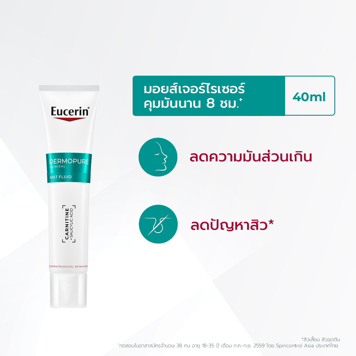 ยูเซอริน เดอร์โมเพียว คลินิคอล แมท ฟลูอิด ฟลูอิดสูตรควบคุมความมัน แนะนำสำหรับผิวมันเป็นสิว ควบคุมความมันส่วนเกิน ผสานสารทรงพลัง Carnitine และ pure Salicylic Acid (BHA)CLINICAL EFFICACY ผ่านการทดสอบทางคลินิก ลดความมันส่วนเกิน รูขุมขน และปัญหาสิวพร้อมเสริมสมดุลไมโครไบโอมบนผิว ควบคุมความมันยาวนาน 8 ชม. เริ่มลดปัญหาสิวตั้งแตวั่นแรกที่ใช้