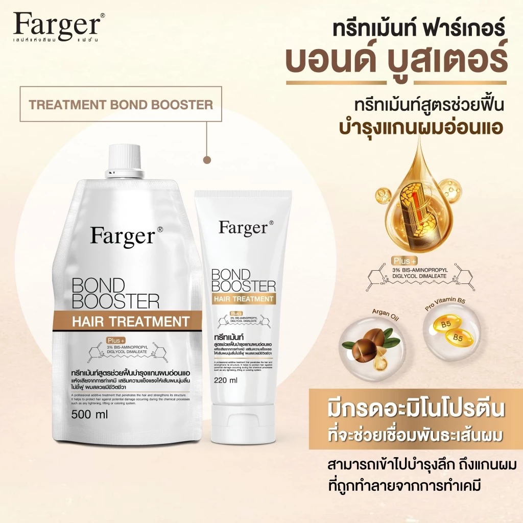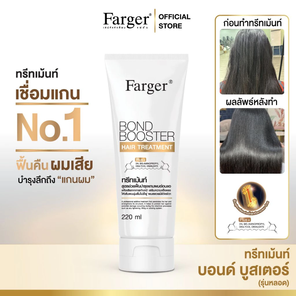 ฟาร์เกอร์ บอนด์ บูสเตอร์ แฮร์ ทรีทเม้นท์ - ทรีทเม้นท์ฟื้นบำรุงผมเสียสะสมจากเคมีแบบเข้มข้น สูตรเพื่อผมสุขภาพดีตั้งแต่ครั้งแรกที่ใช้ ผลิตภัณฑ์ทรีทเม้นท์เข้มข้นที่พัฒนาขึ้นเพื่อตอบโจทย์การดูแลเส้นผมที่ผ่านการทำเคมี เช่น การฟอกสี ยืด ดัด หรือทำสีผม โดยมุ่งเน้นการฟื้นฟูโครงสร้างเส้นผมอย่างล้ำลึกจากภายในสู่ภายนอก ด้วยเทคโนโลยีการเชื่อมพันธะเส้นผม (Bonding Technology) ที่ช่วยเติมเต็มและปกป้องแกนผม พร้อมบำรุงให้เส้นผมกลับมาแข็งแรง มีสุขภาพดี สัมผัสได้ถึงความเปลี่ยนแปลงตั้งแต่ครั้งแรกที่ใช้ มาพร้อมกลิ่นหอมพรีเมียมแบบ Unisex ที่ช่วยลดกลิ่นเคมีขณะใช้งาน กลิ่นหอมละมุนเป็นเอกลักษณ์ ได้รับคำชมจากผู้ใช้จริงว่าหอมโดดเด่นจนเป็นที่ประทับใจ ทรีทเม้นท์สูตรเข้มข้น ฟื้นฟูผมแห้งเสียจากเคมี เติมบอนด์ผมให้แข็งแรง นุ่มลื่น เงางาม พร้อมกลิ่นหอมพรีเมียม ลดกลิ่นเคมีขณะใช้ ทรีทเม้นท์เคราติน ครีมหมักผม เชื่อมแกนผม กู้ผมเสีย ตัวบูสแกนผม