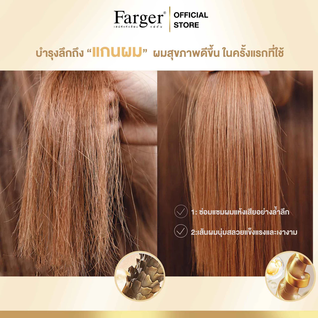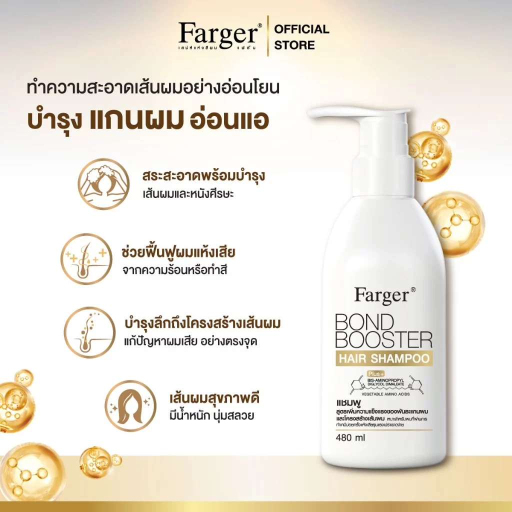 ฟาร์เกอร์ บอนด์ บูสเตอร์ แฮร์ แชมพู คุณสมบัติแชมพู -บอนด์ บูสเตอร์ ช่วยทำความสะอาดเส้นผมอย่างอ่อนโยน เพื่อคืนความแข็งแรงและบำรุงผมที่แห้งเสีย เปราะขาดง่าย จากการทำเคมีให้กลับมานุ่มสลวยเงางามอย่างเป็นธรรมชาติ -อุดมไปด้วยสารสกัด BIS-AMINOPROPYL DIGLYCOL DIMALEATE ผสานกับ Vegetable Amino Acids และ Argan Oil จะช่วยฟื้นผมเสียอย่างล้ำลึกถึงแกนผมด้วยสารบำรุงที่ช่วยเชื่อมพันธะไดซัลไฟด์ (Disulfide Bond) ของกรดอะมิโนโปรตีนที่อยู่ในเคราตินของเส้นผม สารตัวนี้จะช่วยบำรุงเส้นผมที่ถูกทำลายจนทำให้ผมแห้งเสียจากการทำเคมีทุกรูปแบบ โดยเฉพาะการทำสีผม หรือการฟอกผม ให้กลับมายืดหยุ่น แข็งแรงเงางาม ดูสุขภาพดี ช่วยลดปัญหาผมช็อต ผมแห้งดูมีน้ำหนักขึ้นทันทีหลังใช้ช่วยให้ปลายผมไม่พันกันเรียบลื่น