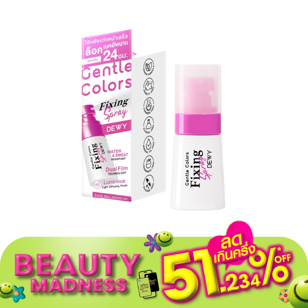เจนเทิล คัลเลอร์ ฟิกซิ่ง สเปรย์ แมตต์สเปรย์ล็อกเมคอัพสูตรดิวอี้ ละอองเนื้อละเอียด สบายผิวช่วยให้เมคอัพติดทนนาน หน้าไม่ดรอประหว่างวันด้วย 3D Film Technologyพร้อมควบคุมความมันบนผิว ไม่เกิดคราบ ผสานสารบำรุงจากพืชธรรมชาติช่วยปลอบประโลมผิวให้แข็งแรง ชุ่มชื้น ดูสุขภาพผิวดี เจนเทิล คัลเลอร์ ฟิกซิ่ง สเปรย์ ก่อนใช้ เขย่าขวดให้ทั่ว ถือขวดห่างจากใบหน้าประมาณครึ่งช่วงแขน กดสเปรย์ 4 ถึง 6 ครั้ง ให้ครอบคลุมทั่วใบหน้าเพื่อเซ็ตเมคอัพ สเปรย์เนื้อบางเบาและละเอียดมากที่ช่วยล็อกเมคอัพให้เปล่งประกายเปล่งปลั่ง ด้วยเทคโนโลยี Dual Film เพื่อการติดทนนานและความสว่างใสที่สะท้อนแสงโดยไม่เป็นคราบหรือเป็นขุย อุดมด้วยสารสกัดจากพืชธรรมชาติเพื่อปลอบประโลม เสริมสร้าง และเติมความชุ่มชื้นให้ผิวของคุณดูสุขภาพดี Gentle Colors Fixing Spray Dewy เขย่าขวดก่อนใช้ กดหัวฉีด 4 ถึง 6 ครั้งเพื่อให้ทั่วใบหน้าเพื่อเซ็ตเมคอัพ
