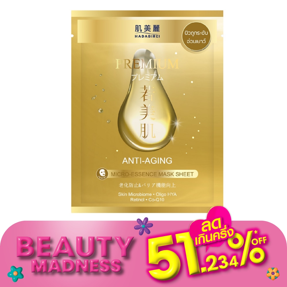 ฮาดะบิเรอิ พรีเมี่ยม แอนไท-เอจจิ้ง ไมโคร-เอสเซ้นส์ มาสก์ ผลิตภัณฑ์มาสก์บำรุงผิวหน้าที่ถูกพัฒนาด้วยเนื้อไฮยาเอสเซ้นส์ พร้อมมอบความชุ่มชื้น และให้ผิวรู้สึกนุ่มสบาย มีส่วนผสมหลักจากประเทศญี่ปุ่น สาเก, ชาเขียว และนัตโตะกัม (โพรไบโอติก) ทรีฮาโลส (พรีไบโอติก) และบิฟิดา (โพสต์ไบโอติก) ที่จะช่วยบำรุงให้ผิวดูสุขภาพดีและช่วยปรับสมดุลเชื้อจุลินทรีย์ในชั้นผิว ผสานคุณค่าจาก PDRN (Polydeoxyribonucleotide) สเปิร์มปลาแซลมอน ฟื้นฟูและซ่อมแซมผิวได้อย่างมีประสิทธิภาพ เติมเต็มคอลลาเจนให้ผิวแลดูอ่อนกว่าวัย พร้อมด้วยอนุพันธ์วิตามินเอ, โคเอนไซม์คิวเทน, สารสกัดโสม และคอลลาเจน ที่ให้ผลลัทธ์ช่วยชะลอความเสื่อมของผิวและเพิ่มความยืดหยุ่นให้ผิว ให้คุณได้เผยผิวดูสุขภาพดีและปราศจากริ้วรอยก่อนวัยอย่างมีประสิทธิภาพ