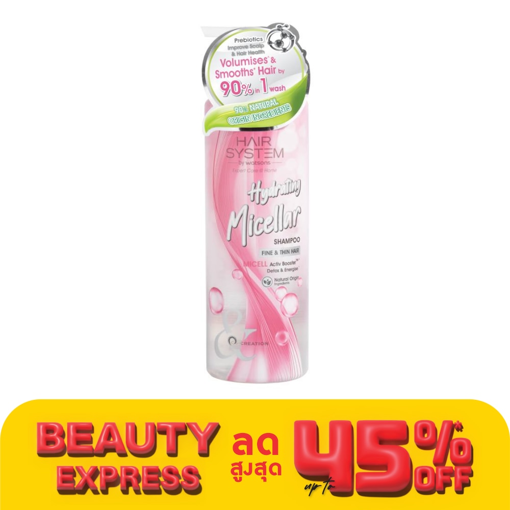 แฮร์ ซิสเตม บาย วัตสัน ไฮเดรติ้ง ไมเซล่า แชมพู สูตรใหม่เพิ่ม Prebiotitics ด้วยเทคโนโลยี Micellar สำหรับการดีท๊อกซ์เส้นผมอย่างมีประสิทธิภาพ ด้วย MICELLACTIV BOOSTERM* พร้อมด้วย French Rose Water Extracts อีกทั้งส่วนผสมที่มาจากแหล่งกำเนิดธรรมชาติมากถึง 90% เพื่อทำความสะอาดเส้นผม และหนังศีรษะอย่างลำลึกและอ่อนโยน ช่วยบำรุงเส้นผมให้แลดูมีวอลลุ่ม มากถึง 90%หลังจากใช้เพียง 1 ครั้ง"" ช่วยให้เส้นผมนุ่มลื่น มีสุขภาพดีอย่างเป็นธรรมชาติ ไม่มีส่วนผสมของ Paraben, Mineral Oil, Silicone, Colourants, SLS, MIT และ MCIT โดยการทดสอบความมีวอลลุ่มของ เส้นผม หลั่งจากใช้ผลิตภัณฑ์ แฮร์ ซึ่สตม บาย วัตสั้น ไอเดรตั้ง ไมเซล่า แชมพู, คอนดิชันเนอร์ และทรีทเมนท์ เจลลี่