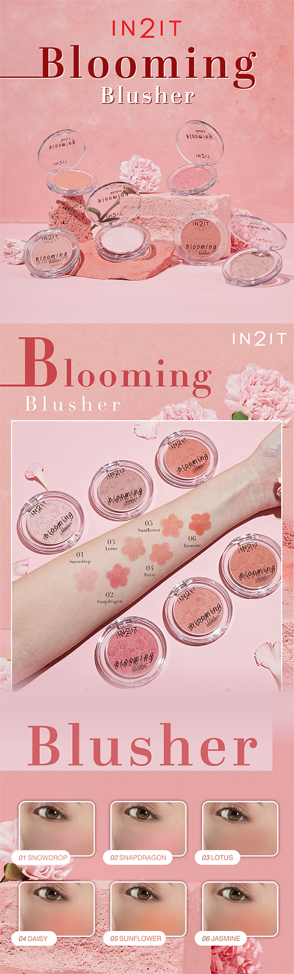 บลัชออน สูตรกันน้ำ ให้สีสันเด่นชัด และติดทนนาน ด้วยเทคโนโลยี Front Injection ทำให้ได้ที่เนื้อบางเบาสบายผิว มอบคุณค่าการบำรุงผิวด้วย สารสกัดจากดอกไม้นานาพรรณ และ Vitamin E ที่ช่วยมอบความนุ่มชุ่มชื้นสู่ผิว ปราศจากน้ำหอม มีทั้งหมด 6 สี