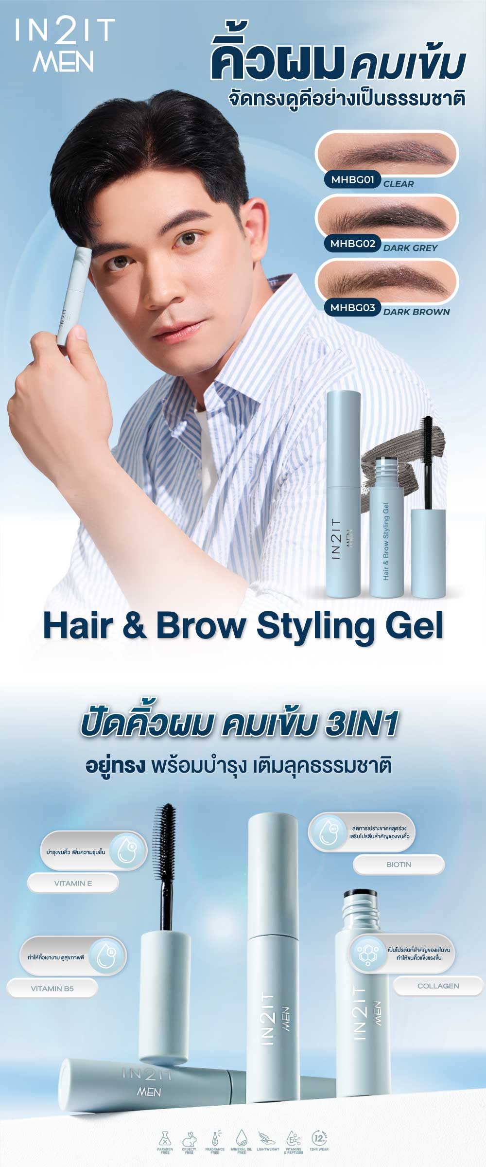 มาสคาร่าจัดแต่งคิ้วให้สวยได้รูป คมชัด มีมิติอย่างเป็นธรรมชาติ เนื้อบางเบา ให้ลุคแมตต์ ติดทนนานโดยไม่เหนียวเหนอะหนะหรือแข็งกระด้าง พร้อมบำรุงด้วยวิตามินอีช่วยให้ขนคิ้วแข็งแรง คอลลาเจนเพิ่มความยืดหยุ่น ไบโอตินกระตุ้นการงอกใหม่ และวิตามินบี 5 บำรุงให้คิ้วดูสุขภาพดี แข็งแรงขึ้นในทุกครั้งที่ใช้ ให้คิ้วของคุณสวยได้ทรง พร้อมการบำรุงอย่างอ่อนโยนในทุกวัน แต่งทรงคิ้วให้สวยงามและบำรุงคิ้ว เนื้อแมตต์น้ำหนักเบาและติดทนนาน ไม่แข็งกระด้าง อุดมด้วยวิตามินอี คอลลาเจน ไบโอติโนอิลไตรเปปไทด์ 1 และบี 5 ช่วยเสริมความแข็งแรงขณะจัดแต่งทรง ส่งเสริมให้ขนคิ้วแข็งแรงขึ้นและสุขภาพดีขึ้น เพื่อลุคที่ดูเป็นธรรมชาติ