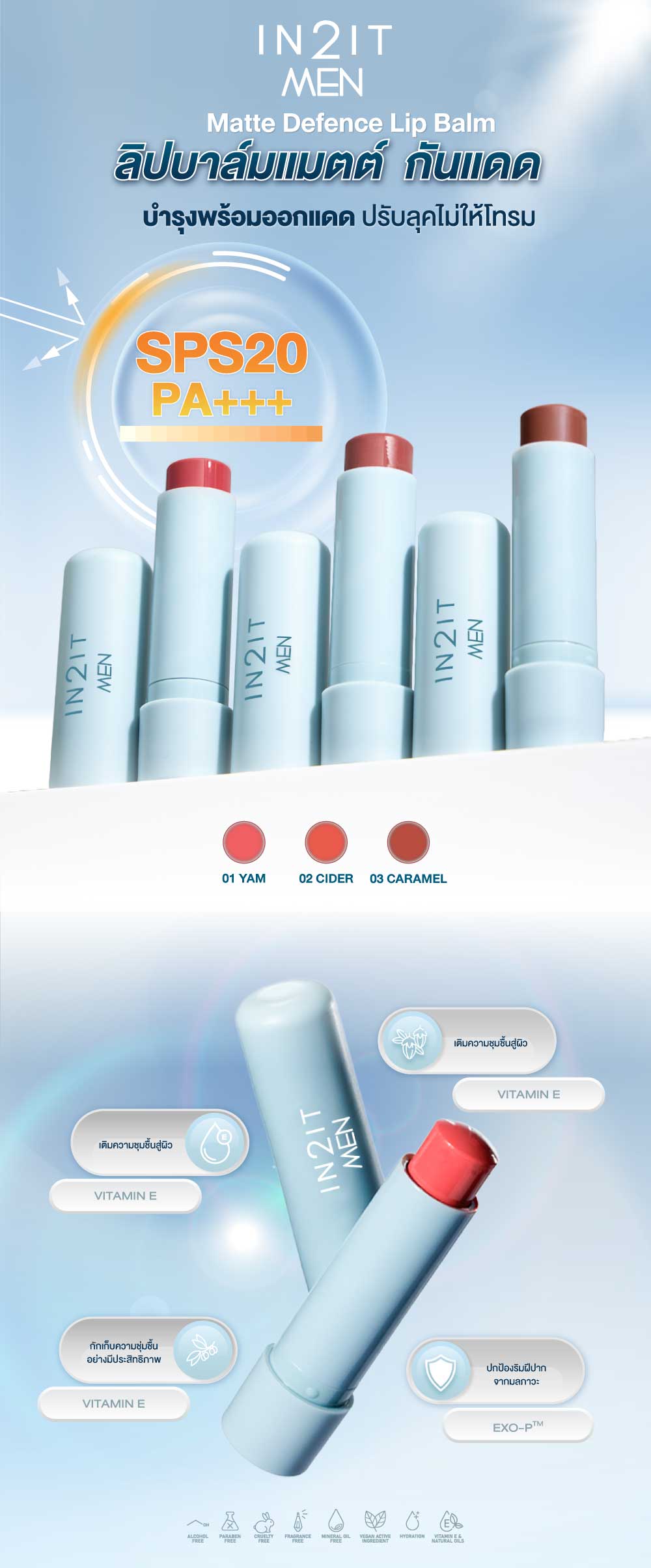 ลิปมันบำรุงริมฝีปากให้เนียนนุ่ม ชุ่มชื้น ผสานคุณค่าของสารสกัดที่ช่วยเติมเต็มความชุ่มชื้นอย่างล้ำลึก พร้อม ปกป้องริมฝีปากให้นุ่มละมุน พร้อมให้ลุคแบบแมตต์ อุดมด้วยคุณค่าจากวิตามินอี น้ำมันโจโจ้บา และ น้ำมันมะกอก ที่ช่วยฟื้นบำรุงและมอบความชุ่มชื้นให้เนียนนุ่ม ปกป้องและถนอมผิวริมฝีปากให้ดูสุขภาพดีอยู่เสมอ พร้อมทั้งมีกันแดด SPF 20 PA ปกป้องริมฝีปากจากความหมองคล้ำและริ้วรอยก่อนวัย ให้ความชุ่มชื้น ปกป้อง และนุ่มนวลริมฝีปากด้วยวิตามินอีแบบแมตต์ โจโจบาและน้ำมันมะกอกช่วยบำรุง ในขณะที่ SPF 20 PA ช่วยปกป้องจากความเสียหายจากรังสียูวี