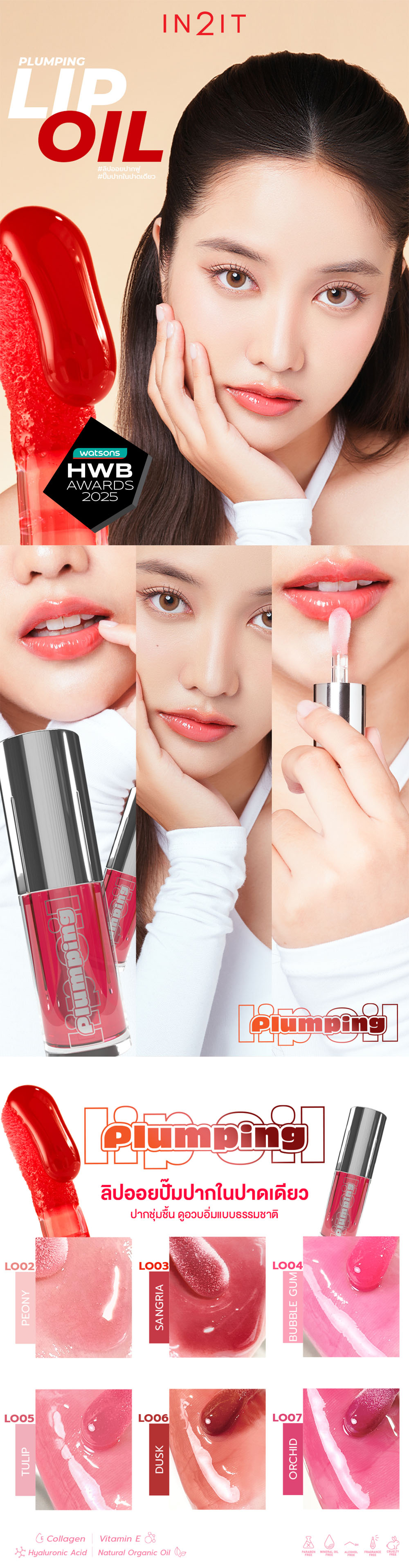 ลิปออยล์เนื้อบางเบา มอบความฉ่ำ แวววาวมากเป็นพิเศษ ให้ความรู้สึกเบา สบายริมฝีปาก และไม่เหนียวเหนอะหนะเวลาทา เนื้อออยมีสีโปร่งใสบาง ๆ ช่วยทำริมฝีปากแลดูมีสุขภาพดี อีกทั้งยังอุดมด้วยส่วนผสมของสารบำรุงเพื่อความนุ่ม ชุ่มชื้น และทำให้ริมฝีปากอวบอิ่ม น่าสัมผัสมากยิ่งขึ้นด้วย 3 คุณสมบัติพิเศษที่ผสานอยู่ใน ลิป ออย เพิ่มความชุ่มชื้นให้กับริมฝีปากได้ยาวนานยิ่งขึ้น เพิ่มความอวบอิ่ม ริมฝีปากดูเปล่งปลั่ง และเพิ่มความกระชับให้ริมฝีปาก เพิ่มความเรียบเนียน ลดร่องปาก และ ริ้วรอย ริมฝีปากแน่นดูเต่งตึง สารบำรุง Marine Collagen Spheres นวัตกรรมเติมเต็มริ้วรอยในรูปแบบใหม่ที่ผสมผสานคุณประโยชน์ของสารสกัด Marine Collagen ซึ่งเป็น collagen จากปลาดาว และ Glycosaminoglycans ซึ่งเป็นสารที่มีอยู่ในโครงสร้างของผิว ถูกทำให้ยู่ในรูปแบบ Sphere และจะค่อยๆ ปลดปล่อยความชุ่มชื้นเข้าสู่ผิว Super Moisture Complex ผสมผสานกันอย่างลงตัว จาก วิตามินอี กรดไฮยาลูโรนิก และน้ำมันออร์แกนิกธรรมชาติ น้ำมันมะพร้าว โจโจ้บาออยล์ และอาร์แกนออยล์ เพื่อเติมเต็มความชุ่มชื้นให้ผิวได้อย่างสูงสุด ให้ริมฝีปากดูสวยอวบอิ่มตั้งแต่ครั้งแรกที่ใช้ พร้อมมอบความชุ่มชื้นให้กับริมฝีปากได้ยาวนานมากยิ่งขึ้น