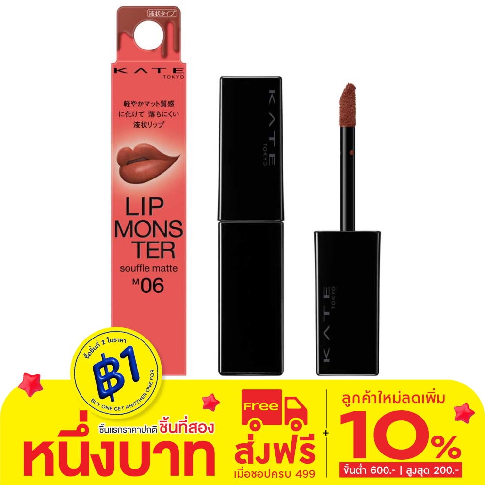 Kate Monster Souffle Lip Matte M06 (Fresh Laterite) พสุธาเร่าร้อน 7 กรัม ลิควิดลิปสติกเนื้อแมท สัมผัสนุ่ม สีสดชัด ติดทนยาวนาน เนื้อลิปเปลี่ยนเป็นฟิล์มให้ความชุ่มชื้น ริมฝีปากไม่แห้ง และลิปสติกไม่เลอะติดมาส์ก และขอบแก้วหลังดื่ม เนื้อแมท สัมผัสนุ่ม ช่วยเบลอบริเวณเส้นขอบปาก สีสดชัดมาพร้อมแปรงแบบพิเศษที่ช่วยสร้างริมฝีปากที่ดูนุ่มฟู ด้วยการปาดเพียงครั้งเดียว ช่วยเบลอเส้นขอบปาก และช่วยให้สามารถไล่ระดับสีบนริมฝีปากทั้งบนและล่างได้อย่างง่ายดาย ให้สีติดทนชัดยาวนานได้หลายชั่วโมงตามคอนเซ็ปต์ของ LIP Monster