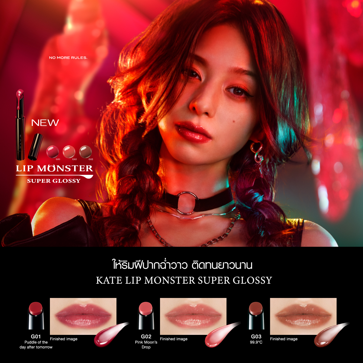 Kate Lip Monster Super Glossy G03 99.9 C 1.6 กรัม กลับมาอีกครั้ง กับมอนสเตอร์ โฉมใหม่ Melty Gloss (ให้ริมปากฉ่ำวาว) ตอบสนองความปรารถนาที่ไม่สิ้นสุด และไม่มีใครหลบหนีจากการหลอมละลายเพื่อเคลือบริมฝีปากได้ ลิปสติกที่หลอมละลาย และให้ความฉ่ำวาวตั้งแต่ครั้งแรกที่ทา ผลิตภัณฑ์ใหม่ในซีรีส์ Lip Monster ที่ติดทนนาน มอนสเตอร์ที่หลอมละลาย ให้ริมฝีปากฉ่ำวาว ลิปสติกที่ให้สีสดชัด ฉ่ำวาว ริมฝีปากนุ่ม เสมือนบำรุงด้วยบาล์ม ฟิล์มเจลที่ละลาย ให้ความฉ่ำวาว และเคลือบสีติดทนนาน เนื้อสัมผัสนุ่มที่สุดในซีรีส์ Lip Monster เนื้อลิปละลาย กระจายความฉ่ำวาว ไม่เกิดร่องริมฝีปาก ติดทนนาน และไม่ทำให้ริมฝีปากแห้ง คุณสมบัติผลิตภัณฑ์ ฉ่ำวาว สีสดชัด ติดทน ริมฝีปากชุ่มชื้นยาวนาน มีส่วนผสมให้ความชุ่มชื้น (กรดไฮยาลูโรนิก) หมุนที่ปลายแท่ง เพื่อให้ผลิตภัณฑ์ออกมาประมาณ 1 มม. ผลิตภัณฑ์ไม่สามารถหมุมกลับเข้าไปได้หลังจากหมุนออกมาแล้ว