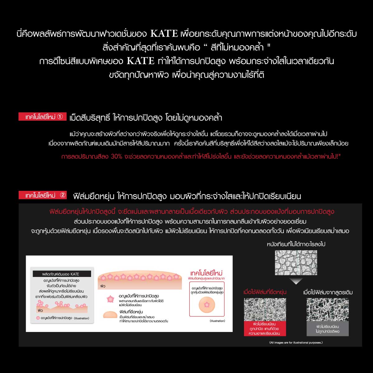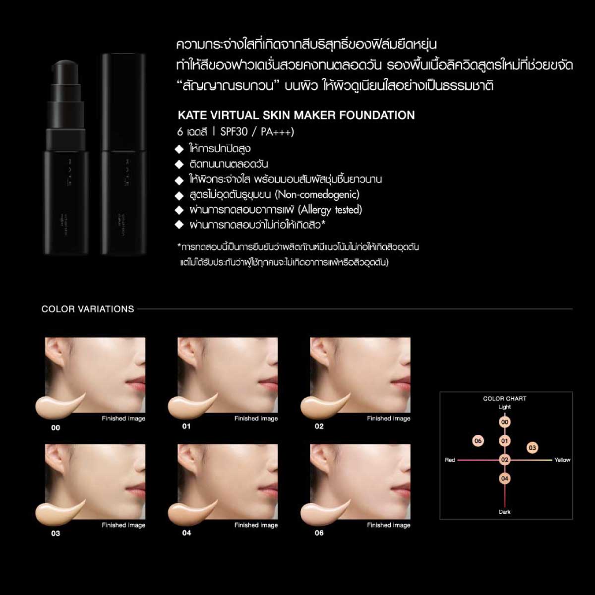 Kate Virtual Skin Maker Foundation 06 25 กรัม รองพื้นเนื้อลิควิดโปร่งแสง ให้ความยืดหยุ่นเป็นธรรมชาติ ติดทนนาน พร้อมมอบผิวเปล่งประกาย ความกระจ่างใสที่เกิดจากสีบริสุทธิ์ของฟิล์มยืดหยุ่น ทำให้สีของฟาวเดชั่นสวยคงทนตลอดวัน รองพื้นเนื้อลิควิดสูตรใหม่ที่ช่วยขจัด สัญญาณรบกวน บนผิว ให้ผิวดูเนียนใสอย่างเป็นธรรมชาติ Kate Virtual Skin Maker Foundation มีให้เลือก 6 เฉดสี Spf30 / Pa+++ ให้การปกปิดสูง ติดทนนานตลอดวัน ให้ผิวกระจ่างใส พร้อมมอบสัมผัสชุ่มชื้นยาวนาน สูตรไม่อุดตันรูขุมขน (Non-Comedogenic) ผ่านการทดสอบอาการแพ้ (Allergy Tested) ผ่านการทดสอบว่าไม่ก่อให้เกิดสิว (การทดสอบนี้เป็นการยืนยันว่าผลิตภัณฑ์มีแนวโน้มไม่ก่อให้เกิดสิวอุดตัน แต่ไม่ได้รับประกันว่าผู้ใช้ทุกคนจะไม่เกิดอาการแพ้หรือสิวอุดตัน)