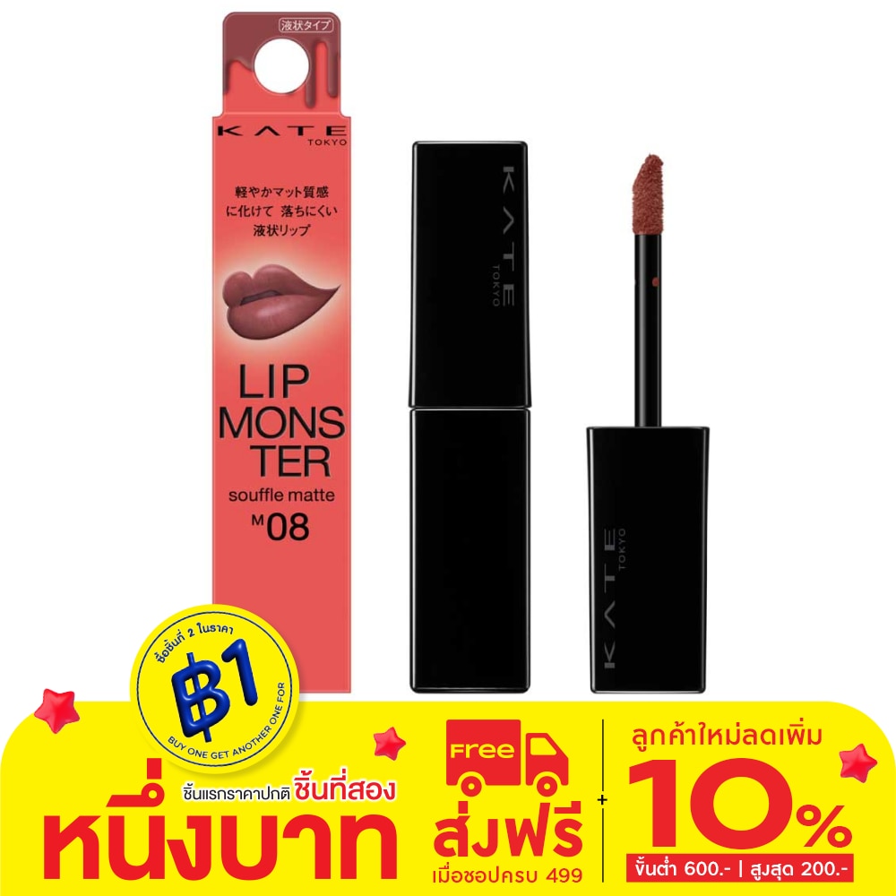 Kate Monster Souffle Lip Matte M08 (Roaring Banquet) พิงค์คาเฟอีน 7 กรัม ลิควิดลิปสติกเนื้อแมท สัมผัสนุ่ม สีสดชัด ติดทนยาวนาน เนื้อลิปเปลี่ยนเป็นฟิล์มให้ความชุ่มชื้นเคลือบริมฝีปาก ริมฝีปากไม่แห้ง และลิปสติกไม่เลอะติดมาส์ก และขอบแก้วหลังดื่ม เนื้อแมท สัมผัสนุ่ม ช่วยเบลอบริเวณเส้นขอบปาก สีสดชัดมาพร้อมแปรงแบบพิเศษที่ช่วยสร้างริมฝีปากที่ดูนุ่มฟู ด้วยการปาดเพียงครั้งเดียว ช่วยเบลอเส้นขอบปาก และช่วยให้สามารถไล่ระดับสีบนริมฝีปากทั้งบนและล่างได้อย่างง่ายดาย ให้สีติดทนชัดยาวนานได้หลายชั่วโมง ตามคอนเซ็ปต์ของ LIP Monster