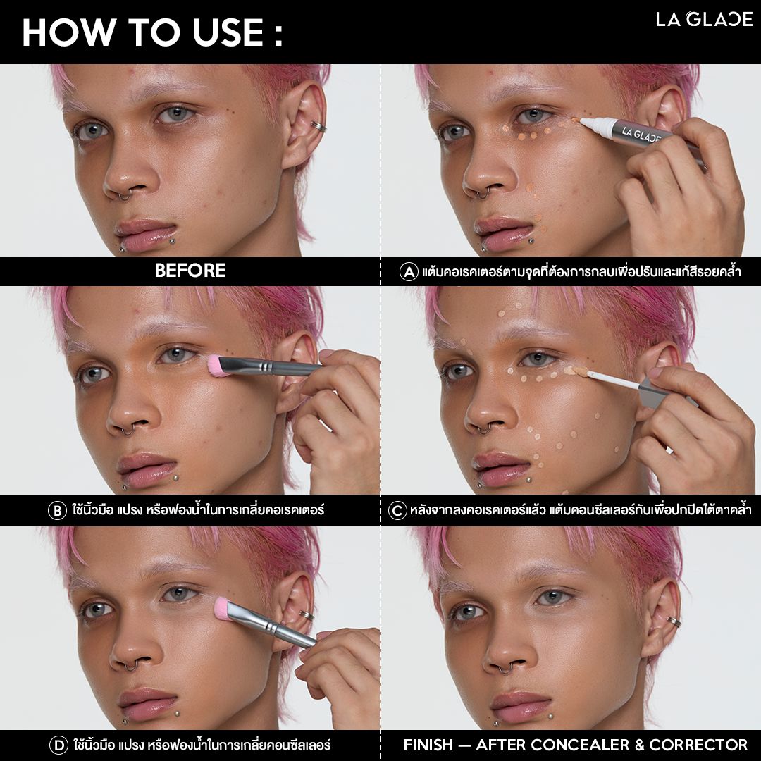 แต้มลงบริเวณที่ต้องการปรับสีผิว เช่น รอยคล้ำใต้ตา หรือจุดที่สีผิวไม่สม่ำเสมอ จากนั้นเกลี่ยเบา ๆ และตามด้วยคอนซีลเลอร์เพื่อการปกปิด