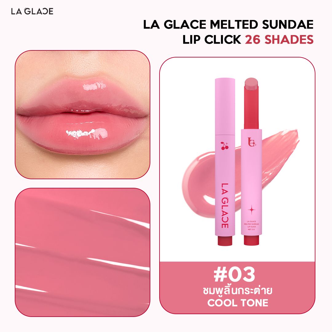 La Glace Melted Sundae Lip Click A whole new sensation with La Glace Melted Sundae Lip Click พบกับความฉ่ำอีกระดับด้วย 10 เฉดสีใหม่คัดแล้วว่าจึ้ง ลิปบาล์มละลายลากลาส เนื้อสัมผัสนุ่ม ทาแล้วฉ่ำขั้นสุดปากอวบอิ่มจึ้ง ไม่ต้องพึ่งฟิลเลอร์ 01CottonCandyชมพูส้มอมนู้ด 02CaramelDrizzleน้ำตาลนู้ด 03DahliaDreamชมพูลิ้นกระต่าย 04CinnamonLustน้ำตาลตุ่นอมชมพู 05ToastedTangerineส้มอิฐ 06BurntAlmondน้ำตาลตุ่นนู้ด 07ChocolateTwistช็อคโกแลต 08GrapeGlitzชมพูอมม่วงกะปิ 09WatermelonKickชมพูติ่งแดง 10Cranberryupแดงก่ำอมน้ำตาล