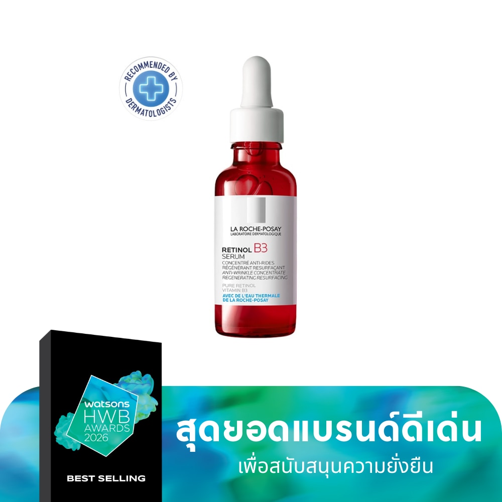 La Roche-Posay ลา โรช-โพเซย์ เรตินอล บี3 เซรั่ม 30มล. เซรั่มผสานโมเลกุลทางการแพทย์ ช่วยลดเลือนริ้วรอยร่องลึกรวมถึงริ้วรอยจากแสงแดด ผิวดูตึงกระชับขึ้น สีผิวดูสม่ำเสมอและเรียบเนียน อ่อนโยนไม่ระคายเคืองต่อผิว ด้วยแรงบันดาลใจจากศาสตร์ของแพทย์ผิวหนัง ลาโรช-โพเซย์จึงคิดค้นเซรั่มโมเลกุลที่ทรงประสิทธิภาพ แต่อ่อนโยน ไม่ทำให้ผิวระคายเคือง ด้วยโมเลกุลเรตินอลช่วยลดเลือนริ้วรอยร่องลึกรวมถึงริ้วรอยจากแสงแดด ผิวดูตึงกระชับขึ้นมา พร้อมกับเทคโนโลยี Gradual Release ที่ทำให้ประสิทธิภาพของเรนินอลยังคงเดิมแต่ไม่ทำให้ผิวระคายเคือง ผสานวิตามิน บี3 และน้ำแร่ ลา โรชโพเซย์ที่ปลอบประโลมผิว พร้อมเสริมปราการผิวให้แข็งแรง รวมถึงมี Glycerin ที่ทำให้ผิวชุ่มชื่นดูอิ่มน้ำ ไม่แห้งกร้านระคายเคือง บรรจุภัณฑ์ -บรรจุภัณฑ์สามารถนำไปรีไซเคิลได้