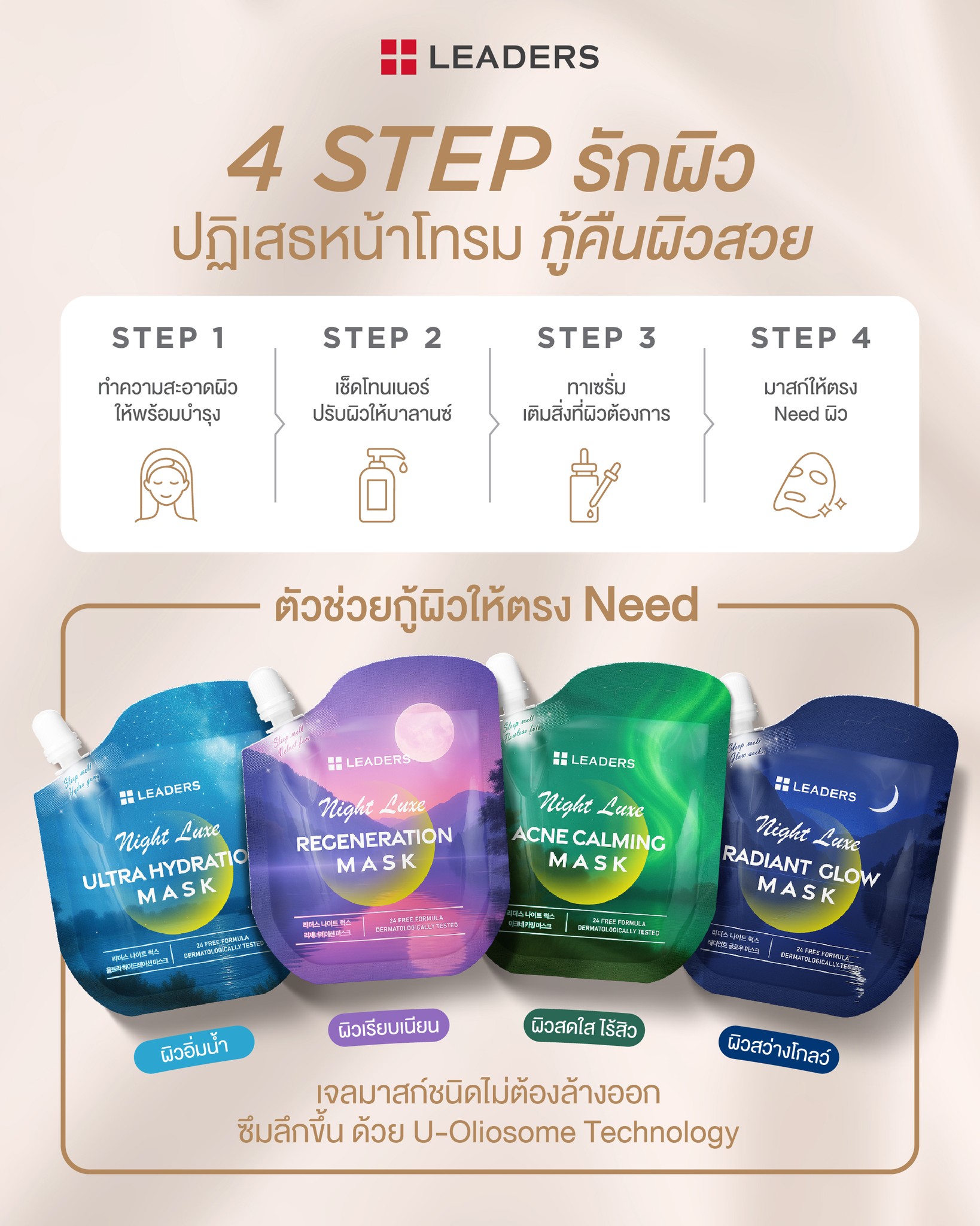 ลีดเดอร์ ไนท์ ลักซ์ เรเดียนท์ โกลว์ มาสก์ มาสก์บำรุงผิวก่อนนอน ฟื้นคืนผิวดูสว่างโกลว์ -U-Oliosome Technology เทคโนโลยี ยู-โอลิโอโซม ห่อหุ้มวิตามินซีในแคปซูล มีขนาดเล็กกว่าไลโปโซมถึง 10 เท่า เพิ่มประสิทธิภาพการส่งผ่านสู่ชั้นผิวที่ลึกขึ้น เพื่อผิวที่ดีขึ้นอย่างรวดเร็วและเห็นได้ชัดเจน -มาสก์ก่อนนอน ให้ผิวดูสว่าง กระจ่างใส ด้วยสารสกัดจากคามู คามู, วิตามินซี และไนอาซินาไมด์ ผสานด้วย U-Oliosome วิตามินซีในแคปซูล PHA ผลัดผิวเสื่อมสภาพอย่างอ่อนโยน Sparassis Crispa Extract แอนตี้ออกซิแดนท์ ฟื้นฟูผิวให้พร้อมรับวันใหม่ -อ่อนโยนต่อผิวบอบบาง ปราศจากสารระคายเคืองผิว 24 ชนิด Free of 6 Parabens, Phenoxyethanol, Triclosan, Chlorphenesin, BHT, Mineral Oil, Fragrance, DEP, Tar Pigments, SLS, SLES, DMDM Hydantoin, Imidazolidinyl Urea, Retinyl Palmitate, Oxybenzone (Benzophenone-3), DEA, Avobenzone, Salicylic Acid, Resorcinol