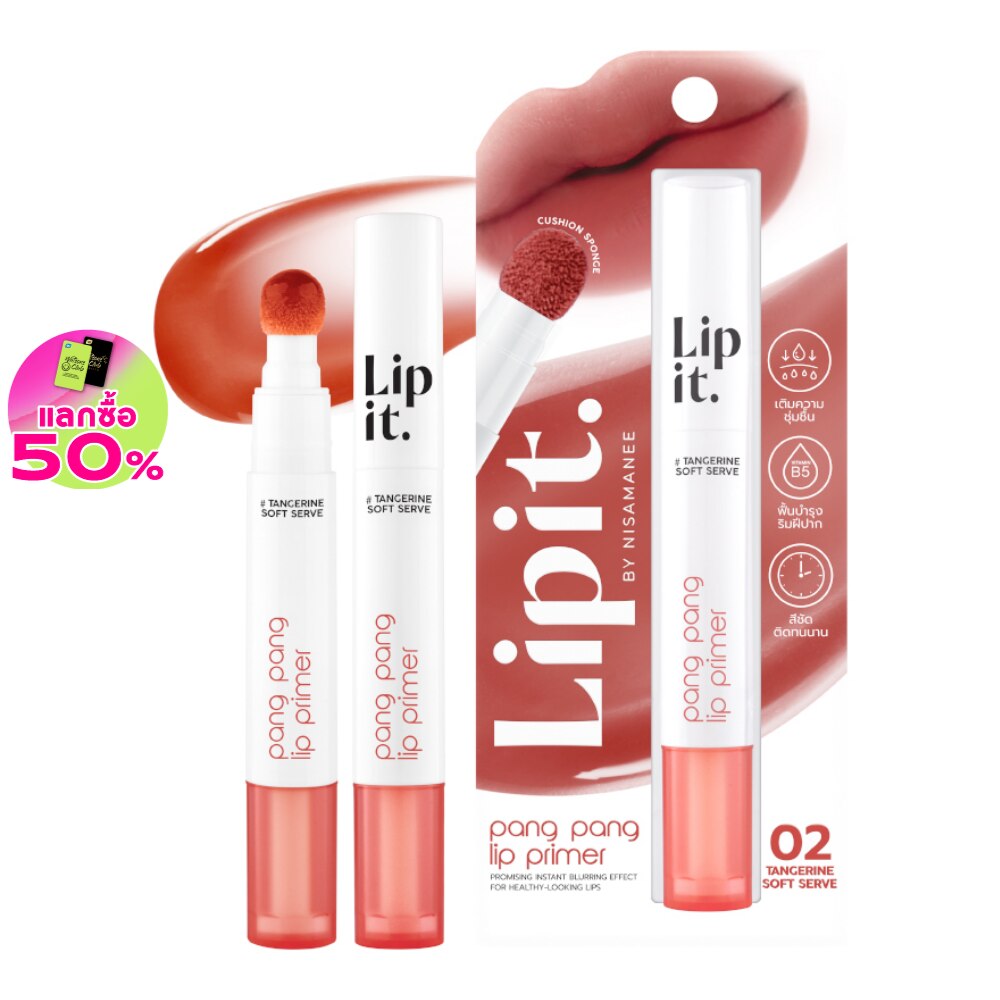 หมดปัญหาร่องปากชัดด้วย ลิปอิท ปังปังลิปไพรเมอร์ เนื้อทินท์บางเบาสบายปาก สีชัด ติดทน เบลอร่องปากให้ดูเรียบเนียน มาพร้อมหัวแปรงคุชชั่นทรงพุ่มกลม ขนนุ่ม ให้สัมผัสนุ่มฟูราวกับขนมปัง ช่วยเกลี่ยเนื้อลิปให้ฟุ้งเบลอ ด้วยคุณประโยชน์จาก Seamollient สารสกัดสาหร่ายสีแดงจากทะเลลึก (Chondrus Crispus Extract) อุดมด้วยสารบำรุงอันเลอค่าจากท้องทะเล ช่วยสร้างแผ่นฟิล์มที่อุ้มน้ำเพื่อคงความชุ่มชื้นให้ริมฝีปาก ผสานคุณค่า Bladderwrack Zea Botanicals สารสกัดสาหร่ายสีน้ำตาล (Fucus vesiculosus) ช่วยชะลอความเสื่อมและเพิ่มความยืดหยุ่นให้ริมฝีปากกระชับ เต่งตึง พร้อมวิตามินบี 5 บำรุงริมฝีปากให้เนียนนุ่ม ทั้งยังมีสารสกัดจากธรรมชาติอย่างซิก้า (Cica) และอโลเวร่า ช่วยปลอบประโลมและปกป้องริมฝีปากแห้งกร้าน พร้อมบำรุงอย่างอ่อนโยน เติมความสดชื่นให้ริมฝีปากดูเรียบเนียนและสุขภาพดี