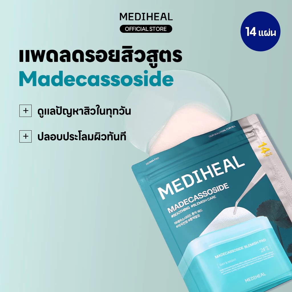 เมดิฮีล มาเดแคสโซไซด์ เบลมิช แพด มีส่วนผสมของ มาเดแคสโซไซด์ วิตามินบี 3 และสารสกัดจากธรรมชาติ 9 ชนิด มีส่วนช่วยลดเลือนจุดด่างดำ ปรับสีผิวให้ดูสม่ำเสมอ กระจ่างใส ฟื้นฟูผิวอ่อนแอหลังเกิดสิวให้กลับมาแข็งแรงและเนียนนุ่ม ด้วย Microparticlized CalmingTox TM พัฒนาโดยเทคโนโลยี Liposome-based ผสานกับสารสกัด Centella Asiatica ที่สกัดมากถึง 2 ครั้ง พร้อมแผ่นบำรุงที่มาในรูปแบบ Gauze Pad จากเส้นใยธรรมชาติ ช่วยให้ส่วนผสมซึมเข้าผิวได้อย่างมีประสิทธิภาพและอ่อนโยน ไม่ระคายเคืองผิว 7 Free ปราศจากแอลกอฮอล์ พาราเบน สารกันเสีย น้ำหอม สี น้ำมันแร่ และ ไตรเอทาโนลามีน หรือ TEA / ผ่านการทดสอบการระคายเคืองจากสถาบันโรคผิวหนังประเทศเกาหลี