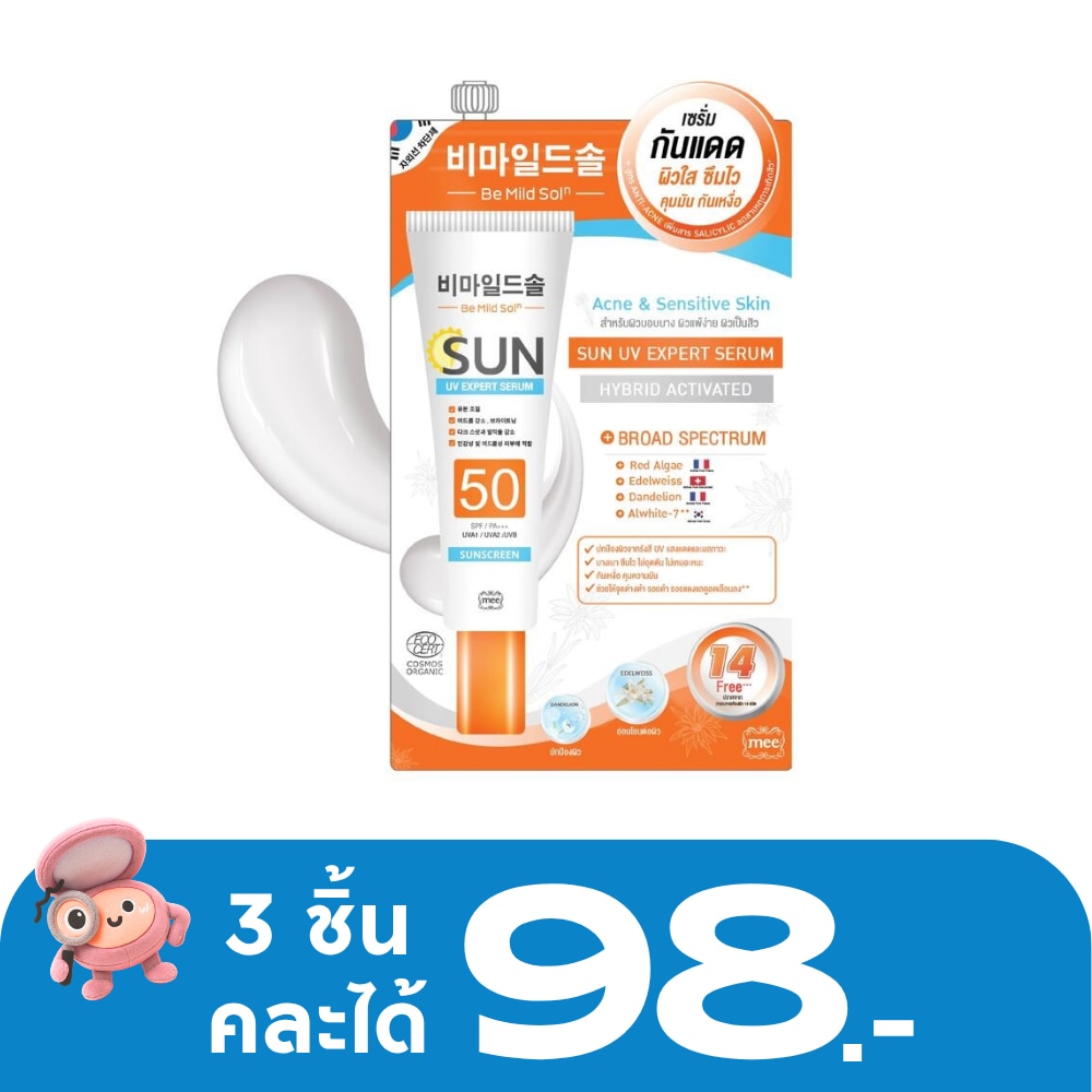 ผลิตภัณฑ์ป้องกันแสงแดดเนื้อเซรั่มสำหรับผิวหน้าและผิวกาย กันแดดเนื้อบางเบา ซึมไว ไม่เหนอะหน้า ผสานการปกป้องผิวจาก Edelweiss ราชินีแห่งดอกไม้จากเทือกเขา Alps ประเทศ Switzerland ด้วยพลังสารกันแดดจากธรรมชาติ Broad Spectrum ปกป้องผิวจาก UVA1 UVA2 และ UVB อ่อนโยนต่อผิวหน้า และสารสกัดจาก DanDelion ตัวช่วยปรนนิบัติผิวที่เสียหายจากมลภาวะ เพื่อผิวที่เรียบเนียนกระจ่างใส พร้อมด้วย Helioguard 365 นวัตกรรมปกป้องผิวจากฝรั่งเศส ช่วยในเรื่อง anti-aging ปกป้องผิวจากความร่วงโรยแห่งกาลเวลา อีกทั้งยังช่วยลดเลือนจุดด่างดำ รอยดำ รอยแดง กันแดด มี บี มาย โซล เหมาะสำหรับผิวแพ้ง่าย ช่วยควบคุมความมันบนใบหน้าตลอดวัน ไม่อุดตัน เหมาะสำหรับผิวเป็นสิว