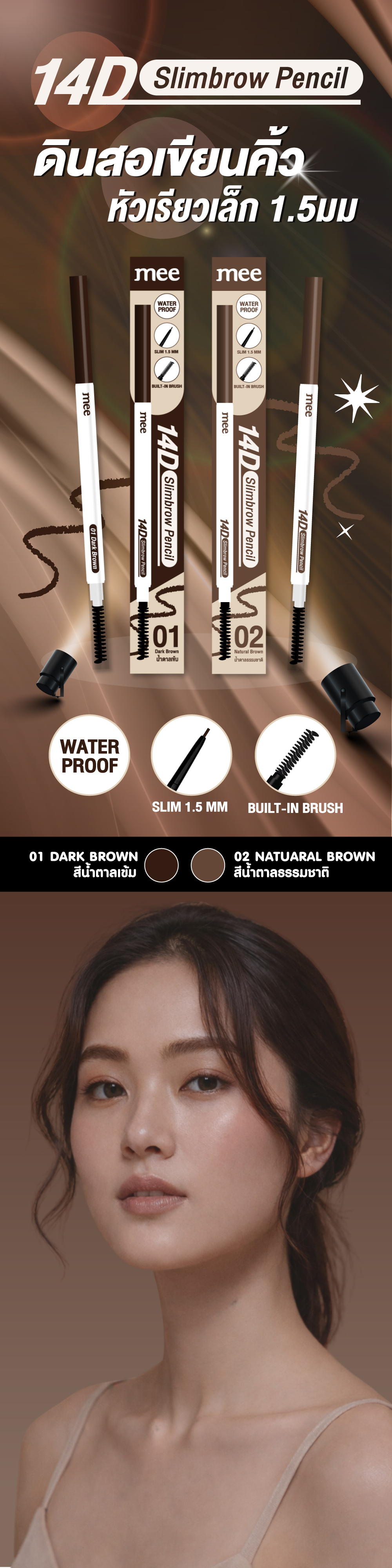 มี 14D สลิมบราวน์ เพนซิล ขนาด 12กรัม ดินสอเขียนคิ้วเนื้อฝุ่นอัดแข็งหัวเรียวเล็ก 1.5 มม. แบบหมุนออโต้ มาพร้อมแปรงปัดคิ้วในแท่งเดียว ปลายเรียวเล็กทุกครั้งที่เปิดใช้งาน จึงง่ายต่อการตกแต่งคิ้วทุกรูปแบบ เนื้อฝุ่นเขียนลื่น เนื้อไม่จับตัวเป็นก้อน เขียนขึ้นโครงคิ้วชัด เรียงเส้นเสมือนขนคิ้วจริง เขียนกรอบหัวคิ้วง่าย วาดตัดหางคิ้วคม ถมคิ้วไว แปรงปัดคิ้วขนาดพอดีกับโครงคิ้ว ทำให้การปัดขนคิ้วแลดูฟูขึ้นรูป เรียงเส้นขนานไปกับแนวขนคิ้วจริง สูตรพิเศษไม่หักง่าย กันน้ำ กันเหงื่อ ติดทนยาวนานตลอด 24 ชั่วโมง