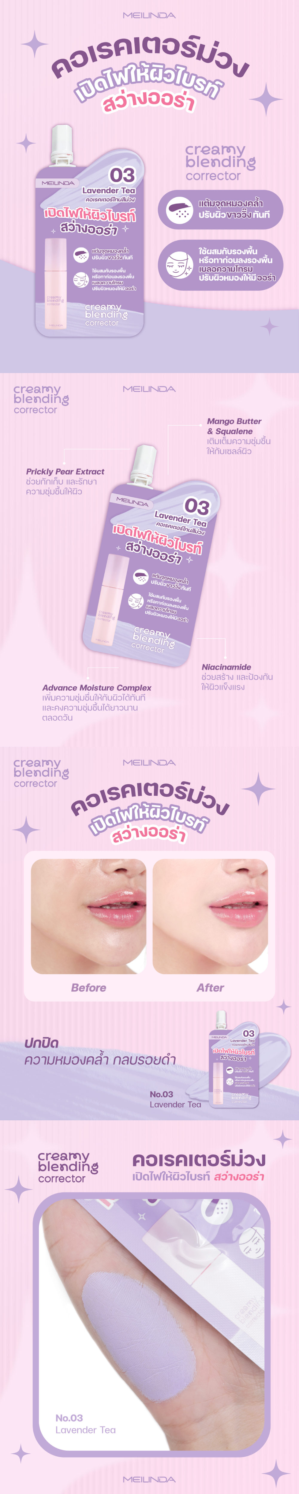 Meilinda Creamy Blending Corrector 03Lavender Tea เมลินดา ครีมมี่ เบลนดิ้ง คอเรคเตอร์ เบอร์ 03 ลาเวนเดอร์ ทีคอเรคเตอร์เนื้อสัมผัสครีมมี่เบลนง่าย โทนสีม่วง ช่วยปรับโทนสีผิวที่หมองคล้ำให้ดูสว่างขึ้น ช่วยแก้ไขอำพรางจุดบกพร่อง ปรับโทนสีผิวและปกปิดได้แนบสนิทไปกับผิวอย่างเป็นธรรมชาติ ให้การปกปิดระดับกลาง สูง ติดทนนาน ไม่เป็นคราบหรือตกร่องระหว่างวัน คุณสมบัติปกป้องผิวมอบความชุ่มชื้นยาวนาน แป้งติดทนคุมมัน ผิวสวยไม่แห้งกร้าน ช่วยปรับสีผิวให้สว่างขึ้นอีกระดับ ป้องกันแสงแดด ปราศจากพาราเบนและน้ำหอม วิธีการใช้ ใช้นิ้วหรือแปรงแตะและเกลี่ยให้ให้เรียบเนียนเพื่อสร้างการปกปิด ข้อแนะนำเมื่อใช้เสร็จควรปิดฝาให้สนิท เก็บรักษาในอุณหภูมิห้อง