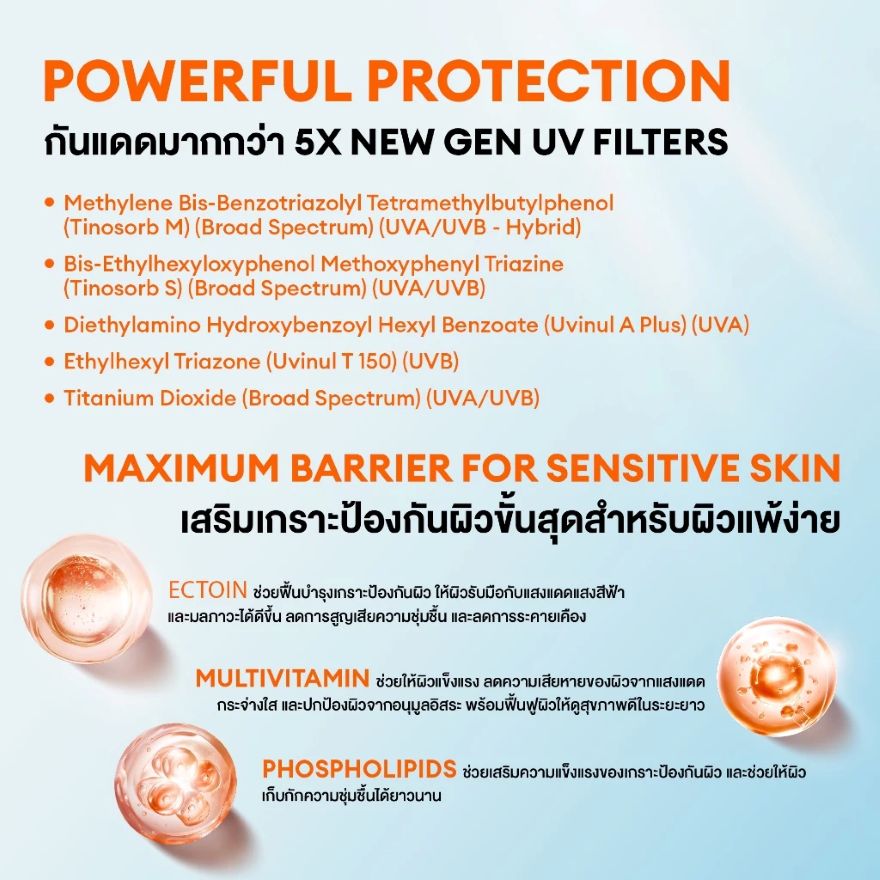ครีมกันแดดเนื้อน้ำ ช่วยป้องกันรังสี UVA และ UVB ได้อย่างยาวนานด้วย SPF 50 PA+++ ให้การปกป้องสูง เนื้อครีมบางเบา แต่ปกป้องอย่างยอดเยี่ยม เกลี่ยง่าย ซึมไว ไม่เหนอะหนะ ไม่ทิ้งคราบขาว อีกทั้งมีนวัตกรรมใหม่แห่งการปกป้องผิวจากแสงแดด เทคโนโลยีพิเศษ Porous power ซึ่งช่วยควบคุมความมัน ช่วยปกป้องผิวจากแสง Blue Light ที่มาจากอุปกรณ์อิเล็กทรอนิกส์ มาพร้อมกับสารบำรุงที่ช่วยให้ผิวยืดหยุ่น และเพิ่มความชุ่มชื้นให้กับผิวด้วยสารสกัดจากจมูกข้าว คอลลาเจน และเมือกหอยทาก ทำให้ผิวดูอิ่มน้ำตลอดวัน ปรับผิวให้สวยใสอย่างเป็นธรรมชาติ