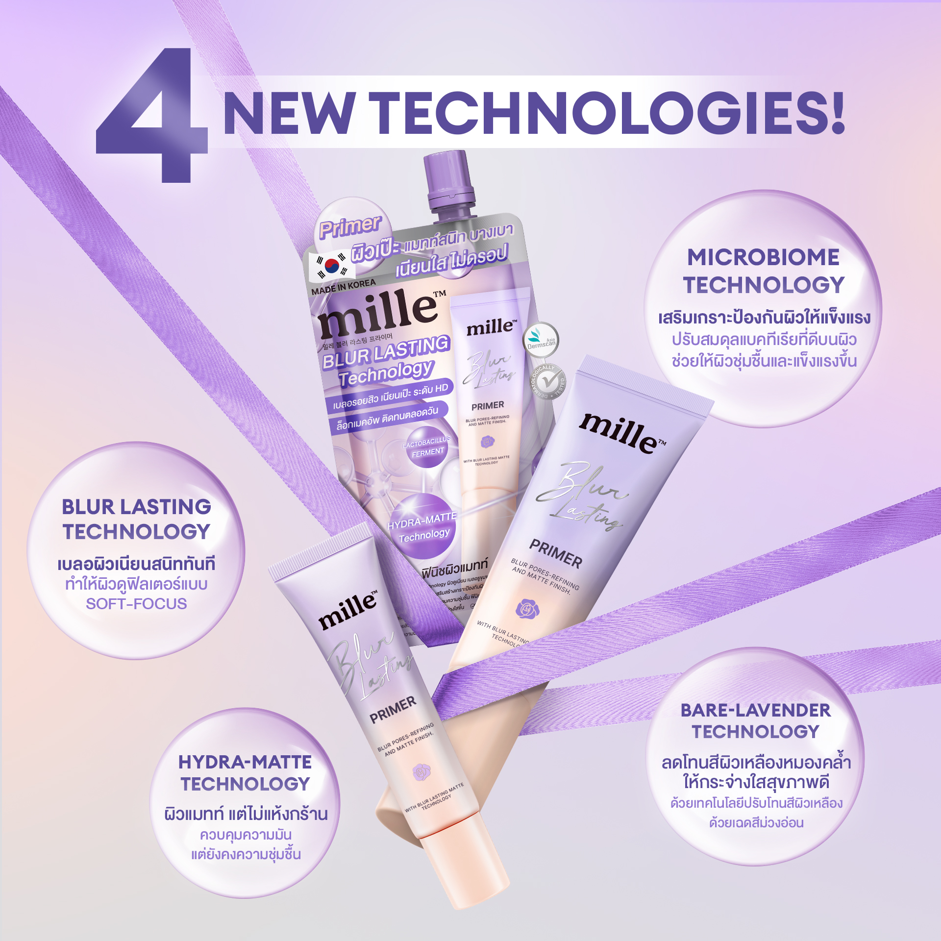 มิลเล่ เบลอ ลาสติ้ง ไพรเมอร์ ขนาด 8กรัม ชนิดหลอดเล็กแบบพกพา นวัตกรรมไพรเมอร์เบลอผิวเนียนสวย ปราศจากพาราเบน ให้ลุคแมทท์ คุมมัน แต่ชุ่มชื้น ไม่แห้งกร้าน พร้อมสกินแคร์บำรุงผิว ไพรเมอร์เนื้อบางเบาที่ปรับผิวให้เรียบเนียนทันทีด้วยเทคโนโลยี Blur Lasting Matte สร้างลุคแมตต์ที่เป็นธรรมชาติ ไร้ที่ติ ติดทนนานตลอดวัน เบลอผิวเนียนกริบ คุมมันทั้งวัน แต่ยังคงความชุ่มชื้น ช่วยลดความเหลืองของผิว อัพผิวไบร์ท กระจ่างใสสุดๆ จะผิวแบบไหนก็แมทท์ได้ คนผิวมัน ผิวผสม คนผิวแห้งใช้ได้สบาย ผิวสวยไม่ไกลเกินเอื้อม เป็นแบบซองพกพาสะดวก จะนำขึ้นมาแต่งตอนไหนก็สะดวก