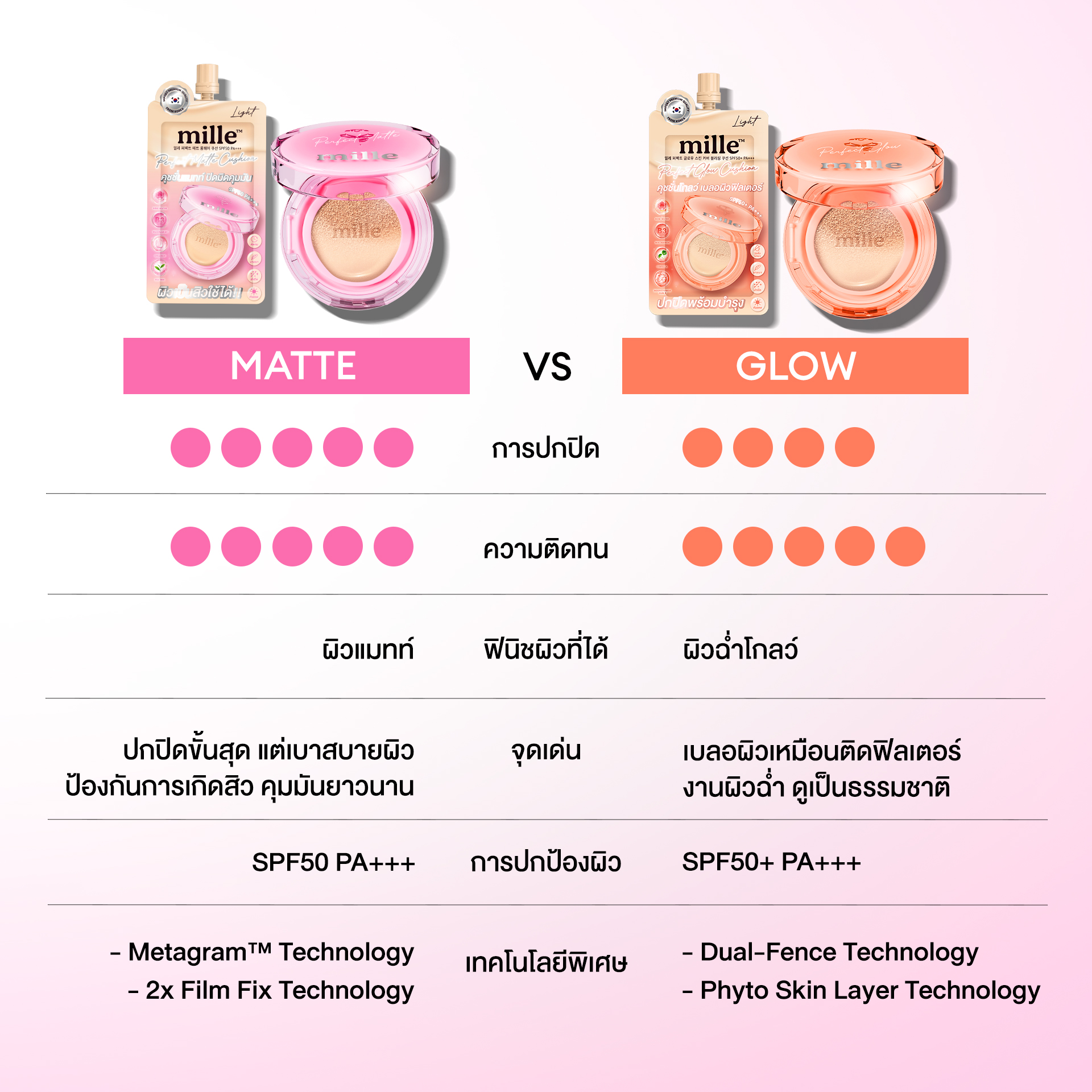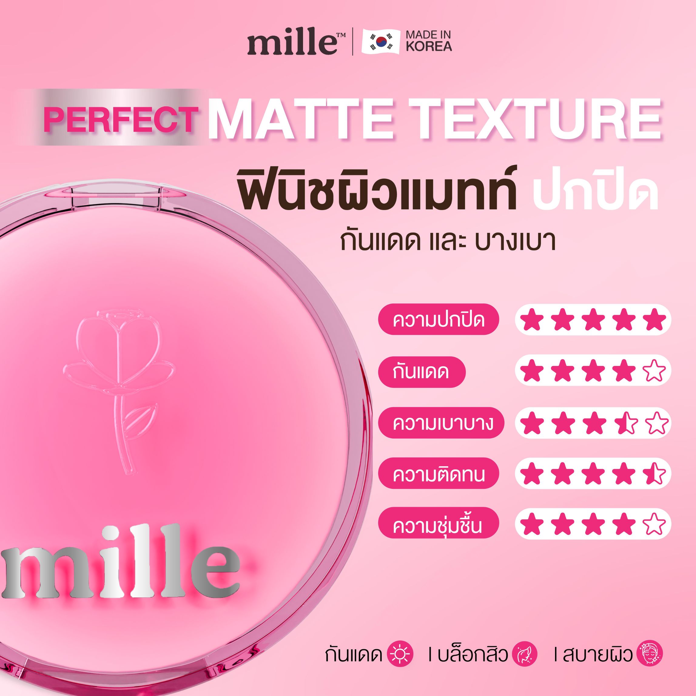 ที่สุดของการปกปิดพร้อมเบลอผิวอย่างไร้ที่ติด้วย PERFECT MATTE LONG WEAR CUSHION SPF50 PA+++ ด้วยเทคโนโลยีเฉพาะ METAGRAMth ที่ช่วยปกปิดผิวขั้นสุด แต่บางเบาถึงขีดสุด มิลเล่ เพอร์เฟค แมทท์ คุชชั่น SPF50 PA+++ ช่วยเติมความชุ่มชื้นและช่วยเพิ่มความยืดหยุ่นผิวให้เนียนเด้ง พร้อมทั้งปลอบประโลมผิว และเทคโนโลยี 2x Flim Fix ที่จะทำให้เมคอัพดูเฟรชใส ยาวนานตลอดทั้งวันวัน พร้อมสารสกัดธรรมชาติที่ช่วยบำรุงผิวถึง 19 ทำหน้าที่เติมความชุ่มชื้นช่วยบำรุงผิวอย่างล้ำลึก ป้องกันการเกิดสิว และต่อต้านอนุมูลอิสระ (วิตามินอี อควาไทด์)