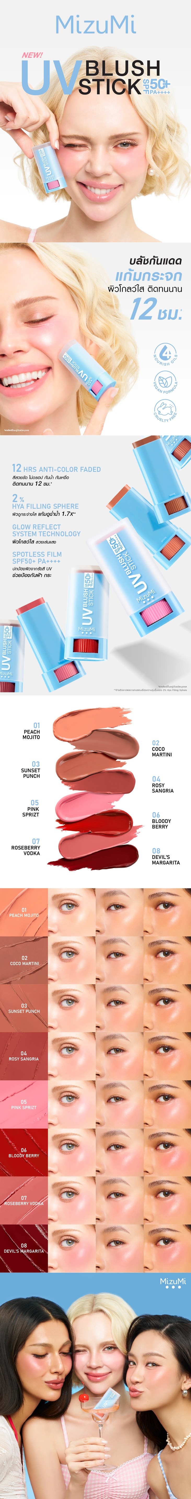 มิซึมิ ยูวี บลัช สติ๊ก SFP50+ PA++++ ปริมาณสุทธิ 4 กรัม บลัชสติ๊กกันแดด เนื้อลื่น เกลี่ยง่าย ไม่เหนียวเหนอะหนะ ให้แก้มดูฉ่ำโกลว์ ชุ่มชื้นด้วยไฮยาลูรอนเพิ่มความชุ่มชื้น มอบสีสดชัด ติดทนนาน พร้อมการบำรุงจากออยล์ธรรมชาติ 4 ชนิด ช่วยให้แก้มดูเนียนนุ่ม กระจ่างใส สุขภาพดี ปกป้องผิวจากรังสียูวีทั้ง UVA และ UVB ช่วยบำรุงผิวให้แลดูกระจ่างใสอย่างเป็นธรรมชาติ ปกป้องผิวจากความแห้งกร้าน พร้อมเสริมเกราะปกป้องผิวจากอนุมูลอิสระ มีเทคโนโลยีการรวมตัวของ Emollient Oil ช่วยสร้างเอฟเฟกต์การสะท้อนแสงบริเวณแก้ม ให้ดูเป็นประกาย ฉ่ำวาว มีมิติในทุกแสง