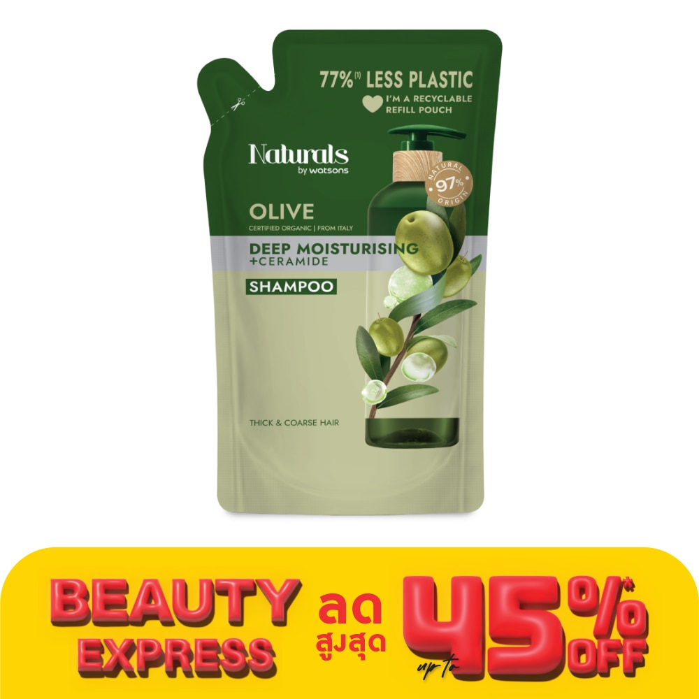 เนเชอรัล บาย วัตสัน โอลีฟ ดีพ มอยซ์เจอไรซิ่ง แชมพู มีส่วนผสมของสารที่มีแหล่งกำเนิดจากธรรมชาติ 97 ผสานคุณค่าการบำรุงจากCeramide ที่ช่วยบำรุงให้เส้นผมดูแข็งแรง เสริมประสิทธิภาพการบำรุงด้วย Organic ltalian Olive ที่อุดมด้วยวิตามิน กรดไขมันธรรมชาติ และสารแอนตี้ออกซิแดนท์ ช่วยฟื้นบำรุงเส้นผมที่แห้งให้กลับมาชุ่มชื้น นุ่มสลวยเปล่งประกายเงางาม อ่อนโยนต่อเส้นผมและหนังศรีษะ เป็นผลิตภัณฑ์ที่พัฒนาเพื่อความยั่งยืนและเป็นมิตรกับสิ่งแวดล้อม ทั้งด้าน วัตถุดิบธรรมชาติที่นำมาใช้ ความปลอดภัยต่อผู้บริโภค และ บรรจุภัณฑ์ที่เป็นมิตรต่อสิ่งแวดล้อม ปราศจากส่วนผสมที่ไม่พึงประสงค์ 20 ชนิด และช่วยลดผลกระทบเชิงลบต่อสิ่งแวดล้อมด้วยการลดปริมาณขยะจากบรรจุภัณฑ์ขวด