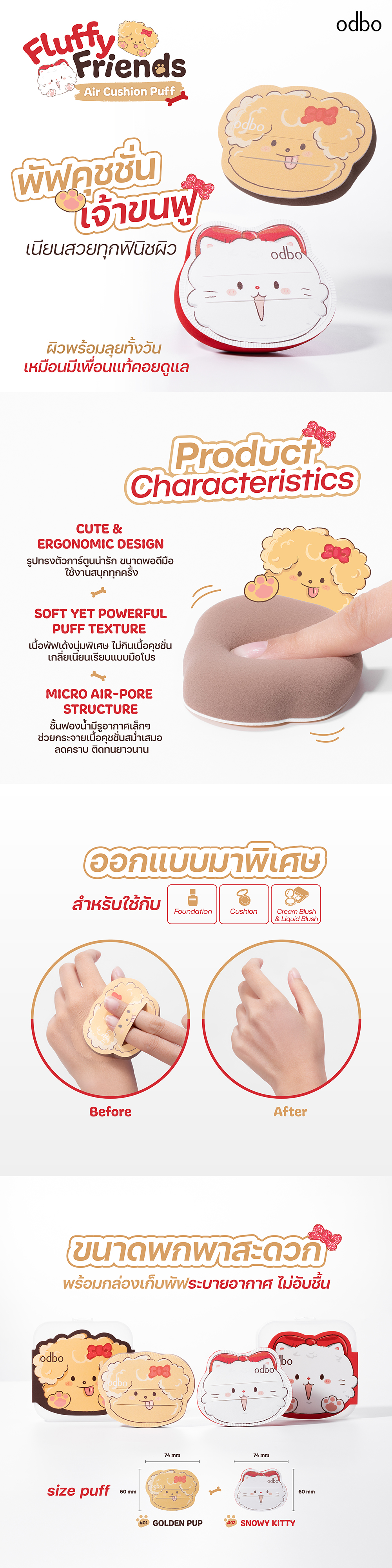 พัฟแต่งหน้ารูปทรงสุดคิวต์ที่ออกแบบมาให้เข้ากับมือและการเกลี่ยเมกอัปได้อย่างลงตัว ที่มาพร้อมดีไซน์พิเศษจากคอลเลกชัน FLUFFY FRIEND ให้เนื้อสัมผัสแบบแอร์คุชชั่นหนานุ่มพิเศษ อ่อนโยนต่อผิวหน้า ให้สัมผัสนุ่มละมุน เฟรนลี่กับทุกสภาพผิว ไม่บาดผิวและไม่กินเนื้อผลิตภัณฑ์ ทำให้ควบคุมปริมาณเมกอัปได้อย่างพอดี เกลี่ยง่าย ไม่เป็นคราบ และช่วยให้เมกอัปติดทนนาน สามารถใช้เกลี่ยได้ทั้งรองพื้น คุชชั่น แป้ง หรือผลิตภัณฑ์เมกอัปอื่นๆ ได้อย่างเรียบเนียน แนบสนิทกับผิวอย่างเป็นธรรมชาติ มีให้เลือกถึง 2 สุดคิวต์ที่ใครเห็นก็ต้องหลงรัก 01 Golden Pup พัฟรูปน้องหมาโกลเด้นสุดซน ขนปุย ดูอบอุ่น น่ารัก น่ากอด, 02 Snowy Kitty พัฟรูปน้องแมวตัวขาวขนฟู ให้ฟีลนุ่มละมุนน่ารักจนใจละลาย